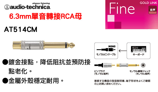 #AudioTechnica #鐵三角 #AT514CM #音訊轉接頭 #6點3mm #RCA #鍍金接點 #志達電子