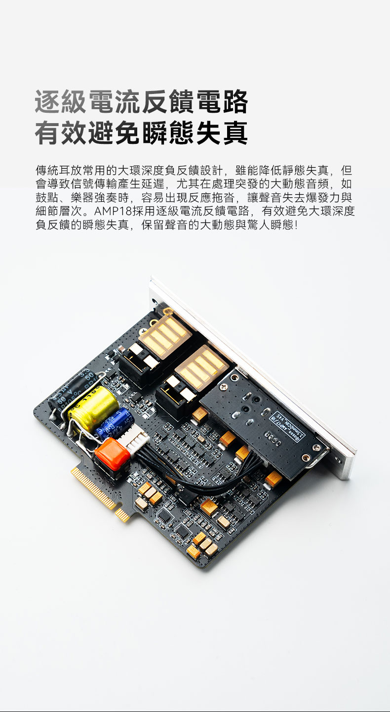 AMP18 同時導入逐級電流反饋電路,避免傳統深度全域負回饋在瞬態音樂中產生的反應遲滯問題,能在保有低失真的前提下,完整呈現大動態音樂的爆發力與瞬間能量,讓聲音更有生命力。