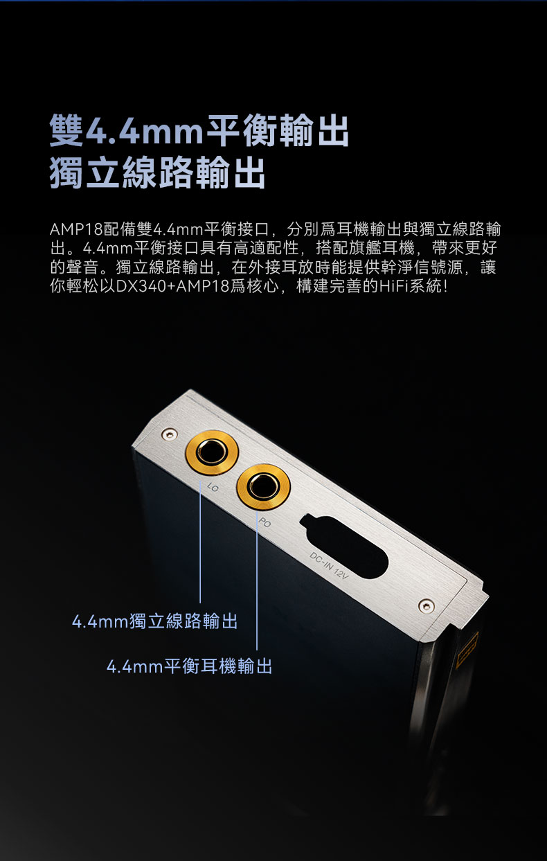 輸出配置方面,AMP18 提供雙 4.4mm 平衡端子,分別對應耳機輸出與獨立線路輸出。耳機輸出專注於高驅動力與聲音密度;獨立線路輸出則可作為外接耳擴或系統核心使用,輕鬆以 DX340 + AMP18 為中心,建構完整的高階 Hi-Fi 系統。
