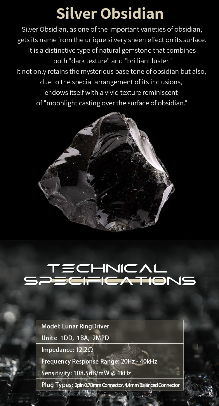 核心技術架構方面,Lunar Ring 使用 1DD、1BA、2MPD 的四單元混合配置,搭配 20Hz–40kHz 頻率響應、12.2Ω 阻抗與 108.5dB/mW 靈敏度,建立出兼具解析能力與驅動效率的基礎。結構設計上,產品資料指出本機採用金屬與樹脂兩種基礎材質,並透過超高精度 3D 列印技術重現月表地形紋理。這裡需要明確區分,腔體本身的金屬與樹脂結構屬於實際機構與配戴相關設計;而銀曜石意象則是 Nature Series 的主題概念延伸,用於視覺風格與系列語言塑造,不應直接誤寫為整個腔體的主要結構材質。外側金屬環除了承接月暈主題,也被用於耳壓平衡與提升動圈後腔空間表現,進一步影響低頻彈性與佩戴舒適度。