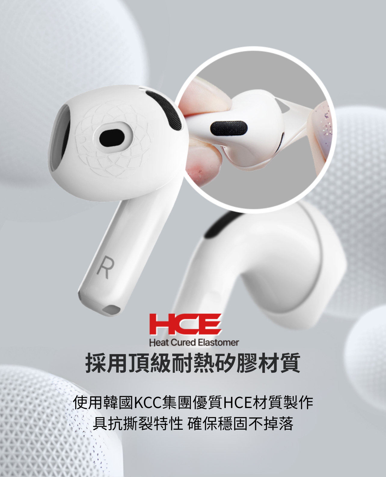 核心技術設計方面,SednaEarfit for AirPods 4 主要著重在材質、表面結構與尺寸策略。材質採用HCE(Heat Cured Elastomer)耐熱矽膠,具備高耐熱、抗撕裂與穩定支撐等特性,並強調長時間使用下的耐用性與固定性。表面部分導入圖騰紋理,藉由提升摩擦係數來加強佩戴穩定度,減少日常移動時的滑動感。尺寸方面則提供Ultra Slim(S)與Slim(M)兩種版本,前者偏向輕薄舒適、降低存在感,後者則偏向更緊密貼合與穩定支撐,並有助於ANC表現提升。整體結構依AirPods 4本體開發,保留感應區域與主要使用功能,不影響日常操作邏輯。