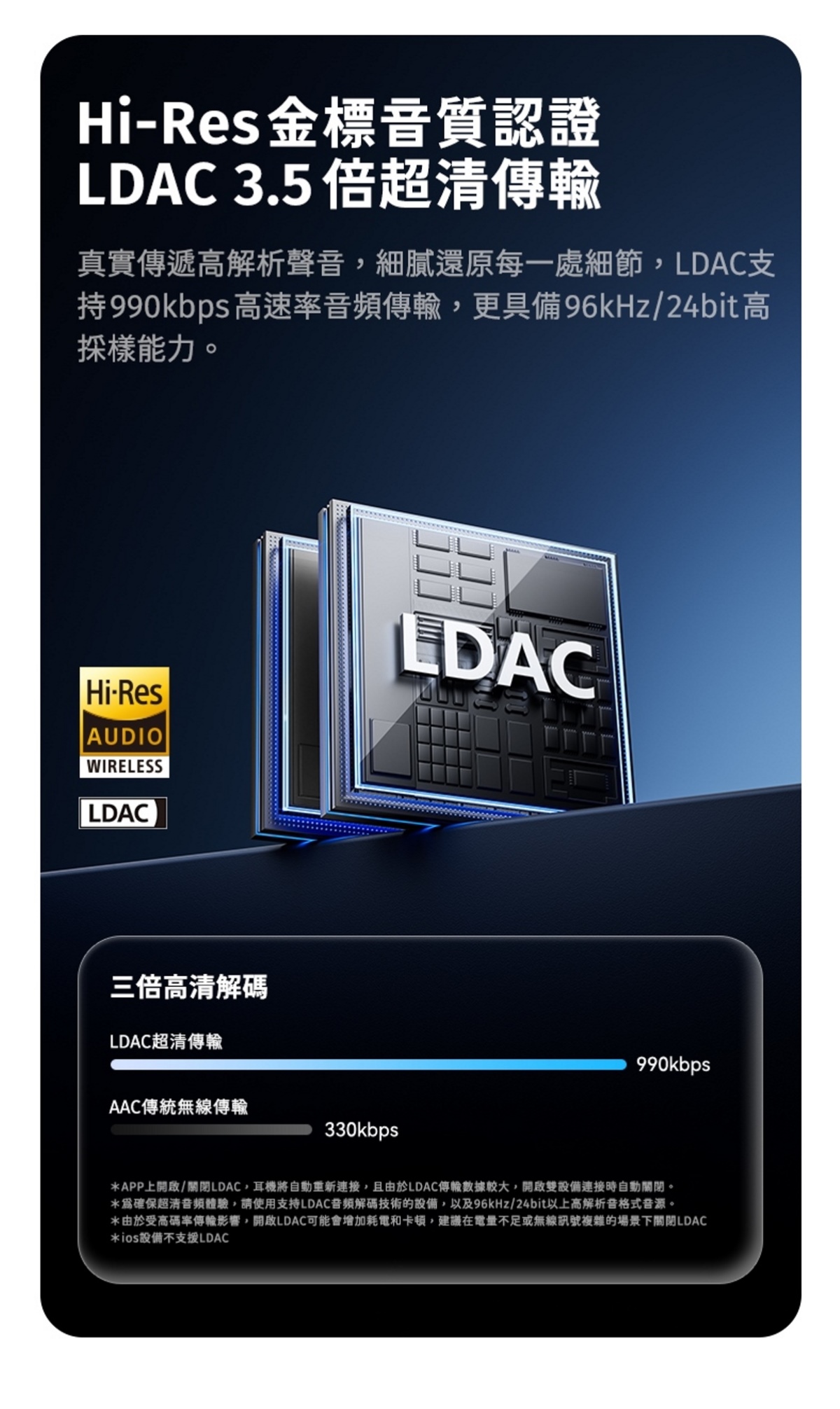 ● 支援Hi-Res Audio Wireless與LDAC,最高可對應96kHz/24bit傳輸能力