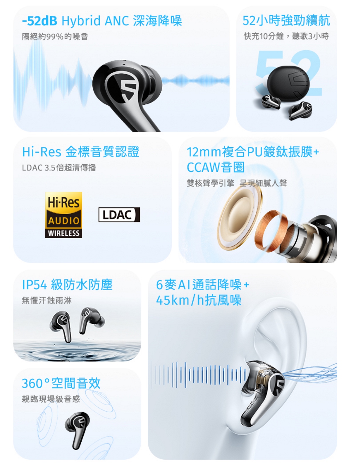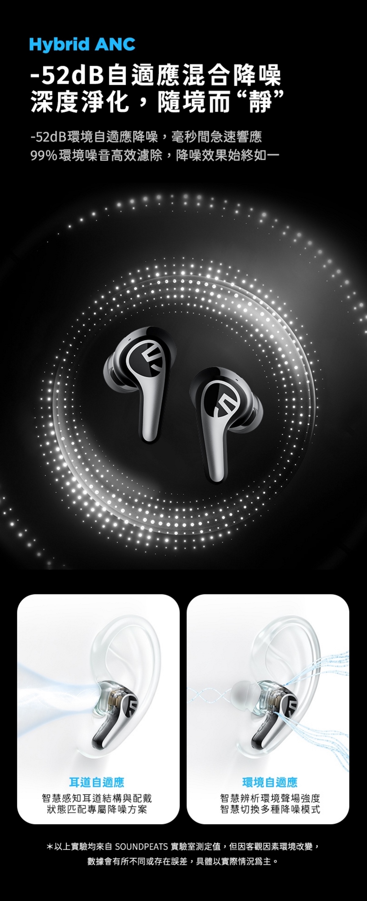 ● 支援最高-52dB自適應混合降噪,對應多場景噪音變化快速調整