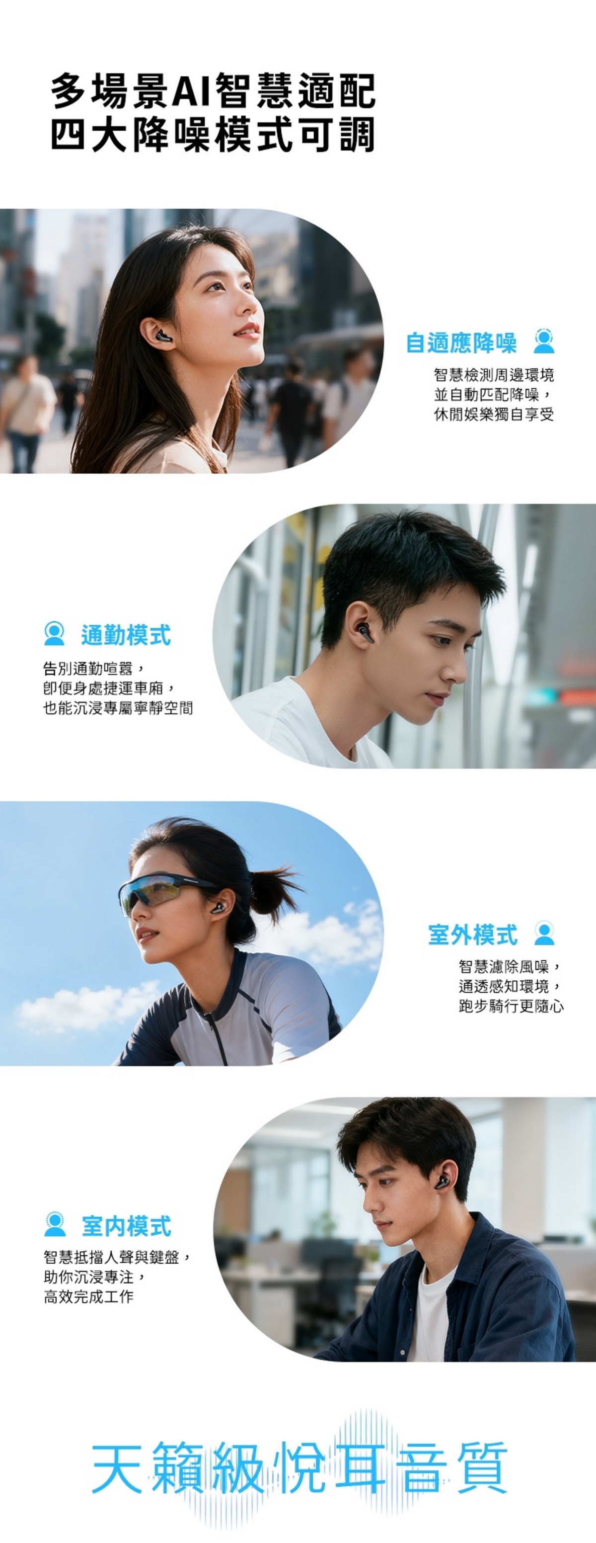降噪模式:自適應模式、通勤模式、室外模式、室內模式