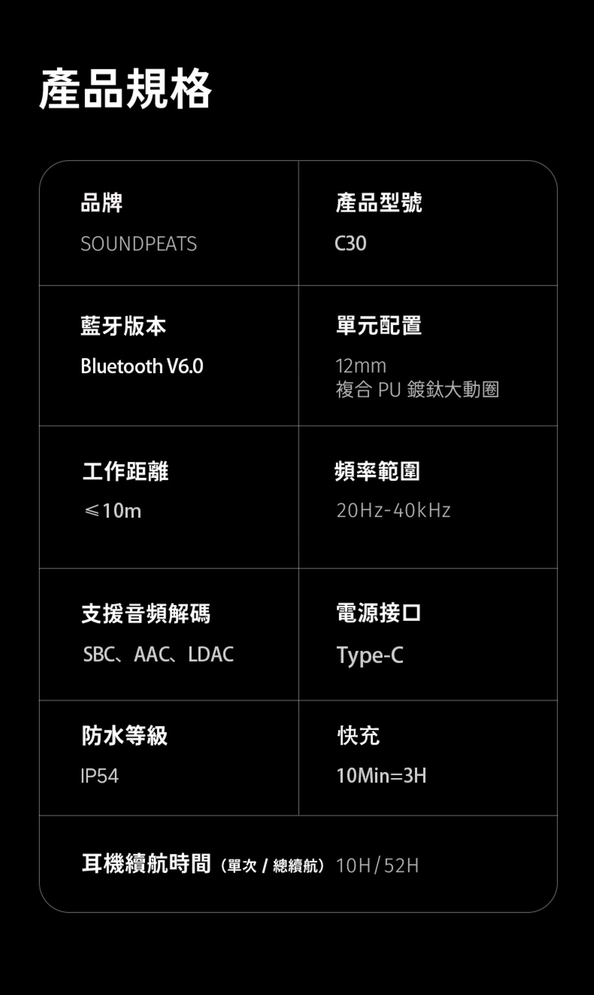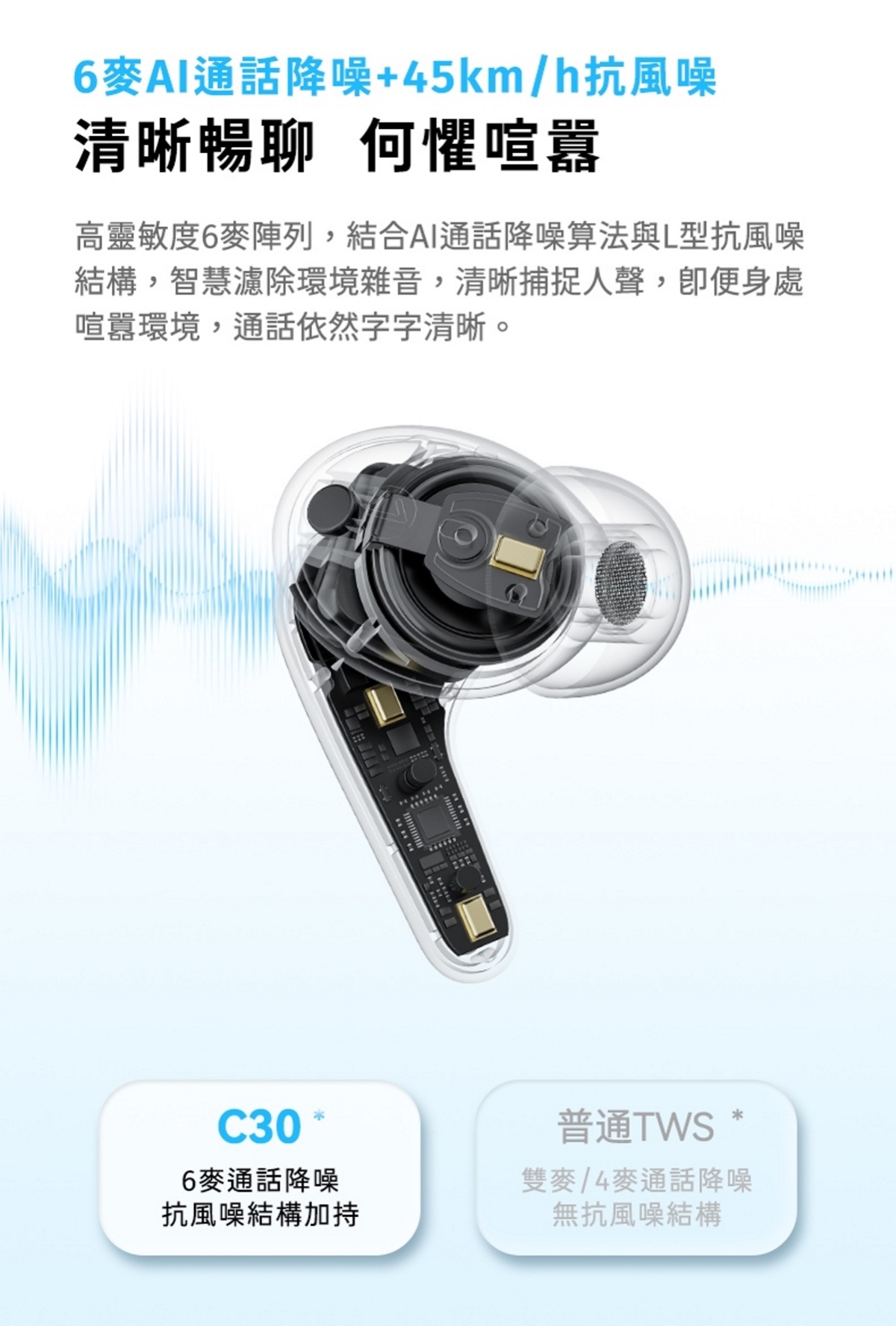 核心技術架構方面,C30結合降噪、聲學、通訊與無線傳輸四大重點。降噪部分採用Hybrid ANC混合式主動降噪技術,最高可達-52dB降噪深度,並可依耳道結構與環境噪音進行自適應調整,另支援自適應、通勤、室外、室內等四種智慧模式。發聲核心搭載12mm複合PU鍍鈦振膜大動圈與CCAW音圈,配合DynamicEQ Pro自動動態均衡演算法,針對高、中、低頻進行動態校正。無線傳輸部分支援SBC、AAC與LDAC編碼,並取得Hi-Res Audio Wireless認證,可對應高解析傳輸需求。通話系統採6麥克風陣列,結合AI通話降噪與L型抗風噪結構,官方標示可對應45km/h風噪環境。另搭載藍牙6.0晶片、53ms低延遲模式、360度空間音效、雙裝置連線與APP深度自訂功能,形成完整的使用體驗架構。