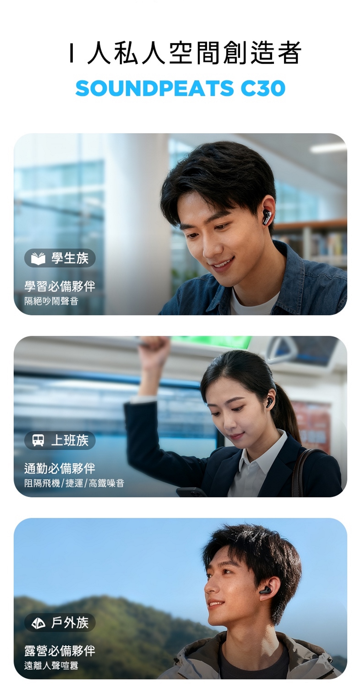 使用建議上,C30特別適合通勤族、學生族、上班族以及重視降噪與續航表現的日常使用者。若主要場景是捷運、高鐵、辦公室、自習空間或戶外移動,可透過不同降噪模式切換,取得更貼近環境的靜謐程度。若偏重音樂播放,建議搭配LDAC與APP中的EQ自訂功能,進一步調整聲音取向;若常用於遊戲或影音,53ms低延遲模式能帶來更一致的聲畫同步。其符合人體工學的傾斜入耳式結構也有助提升耳道貼合度與配戴穩定性,搭配IP54防護等級,面對汗水、細雨與高頻使用情境時更具實用性。