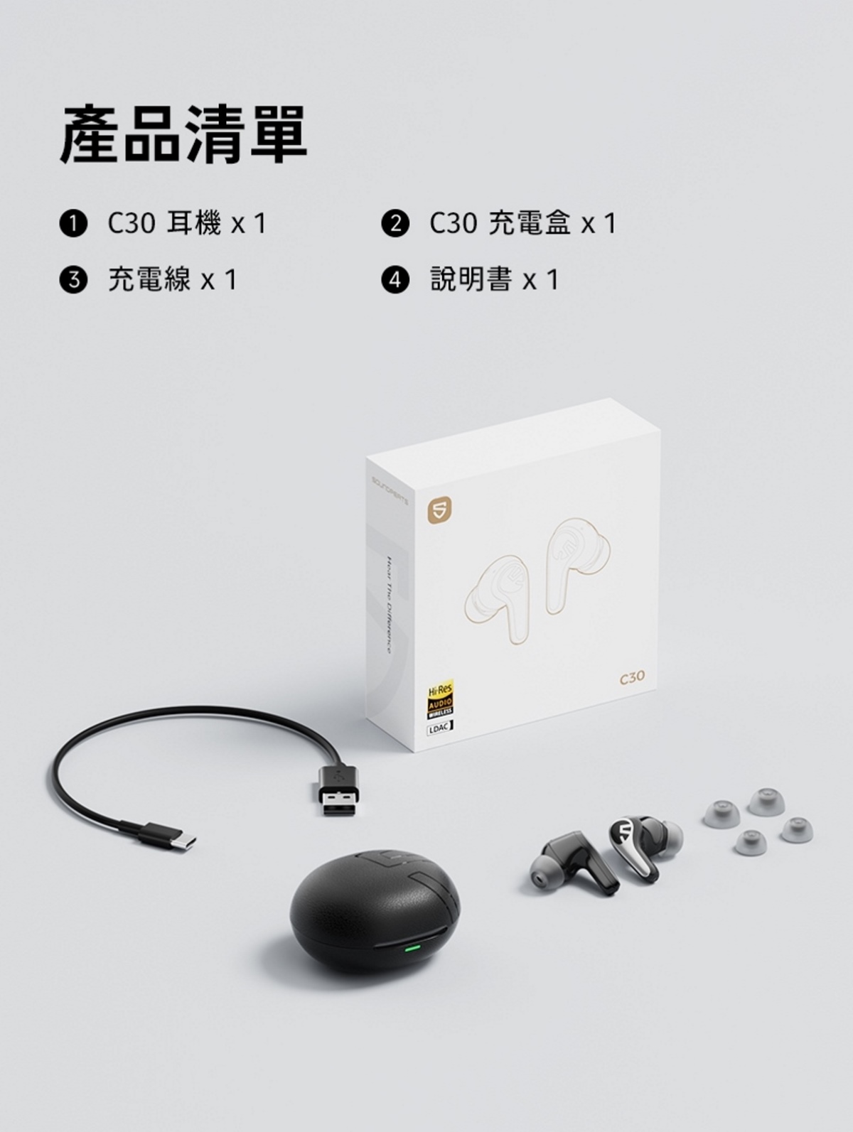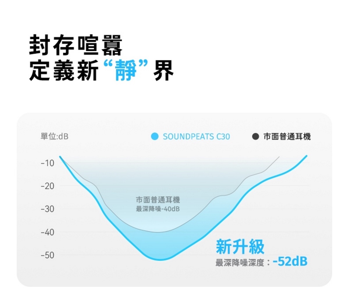 聲音表現方面,C30以均衡清晰並帶有現代感能量的走向為基礎。低頻具備良好的下潛深度,量感充足而不鬆散,控制力穩定,鼓點收放具備彈性,能兼顧節奏感與背景鋪陳。中頻人聲距離適中,厚度自然,密度表現紮實,對流行人聲與日常影音內容都有不錯的存在感與清楚口型。高頻延伸完整,亮度控制偏乾淨俐落,細節量表現充足,能將泛音與輪廓較清楚地帶出。音場表現以真無線降噪耳機而言具有不錯的寬度與左右分離感,深度表現整齊,定位穩定。動態方面具備良好的瞬態反應與能量傳遞,對節奏明快的音樂與遊戲音效有直接清楚的反應;背景純淨度則受益於主動降噪系統與耳道密合設計,在噪音環境下仍能保有不錯黑度,提升沉浸感與聆聽專注度。