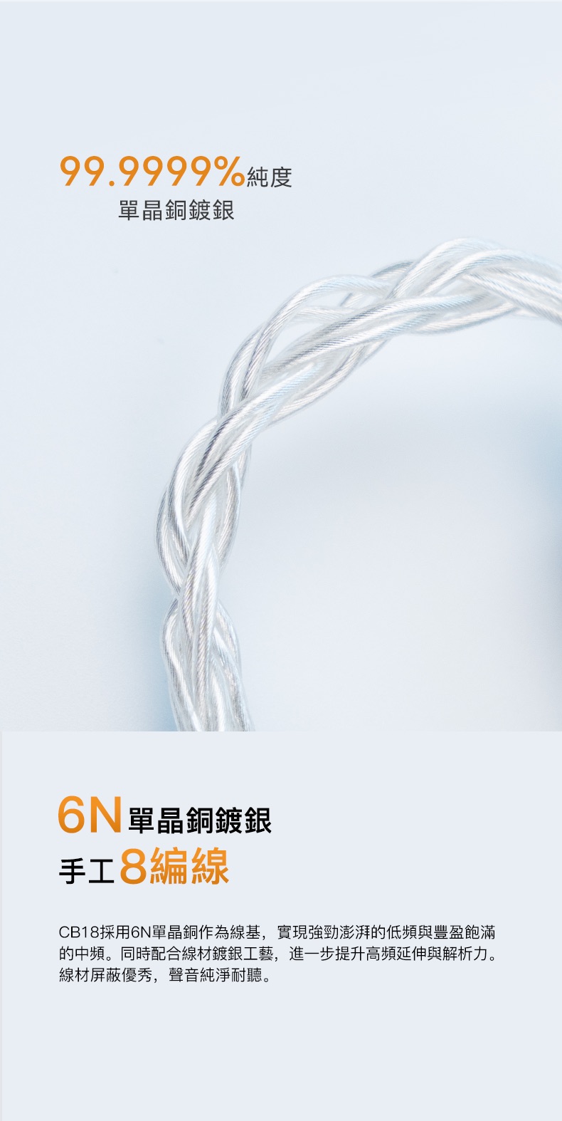 ● 採用 99.9999% 高純度 6N 單晶銅鍍銀線材,細膩傳導、解析力出眾