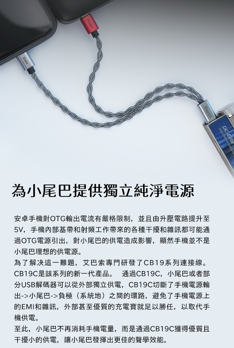 隨著Hi-Fi行動音頻普及,許多使用者發現手機OTG輸出電流限制與電磁雜訊常導致小尾巴供電不穩、音質受干擾。iBasso為了解決這項痛點,專門研發了CB19C Type-C小尾巴獨立供電線,為小尾巴提供「乾淨且穩定」的獨立電源來源。