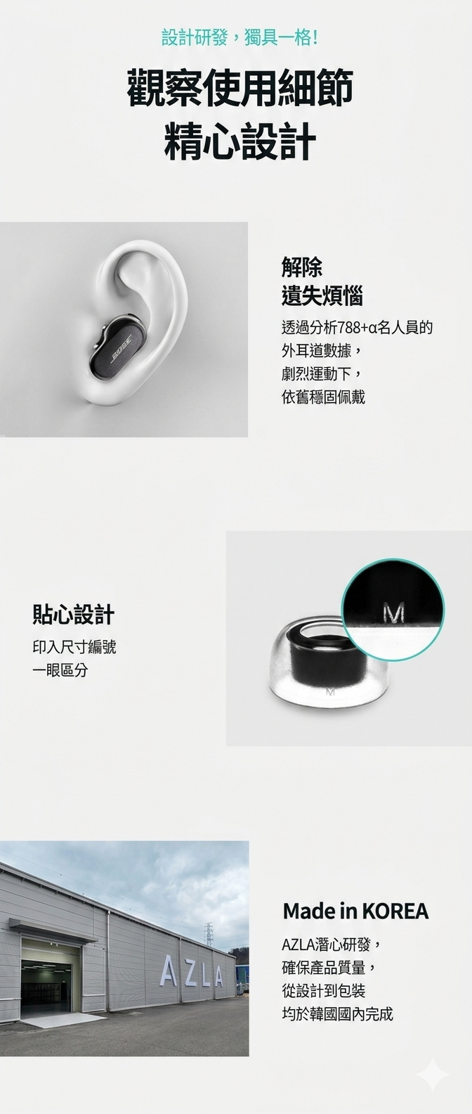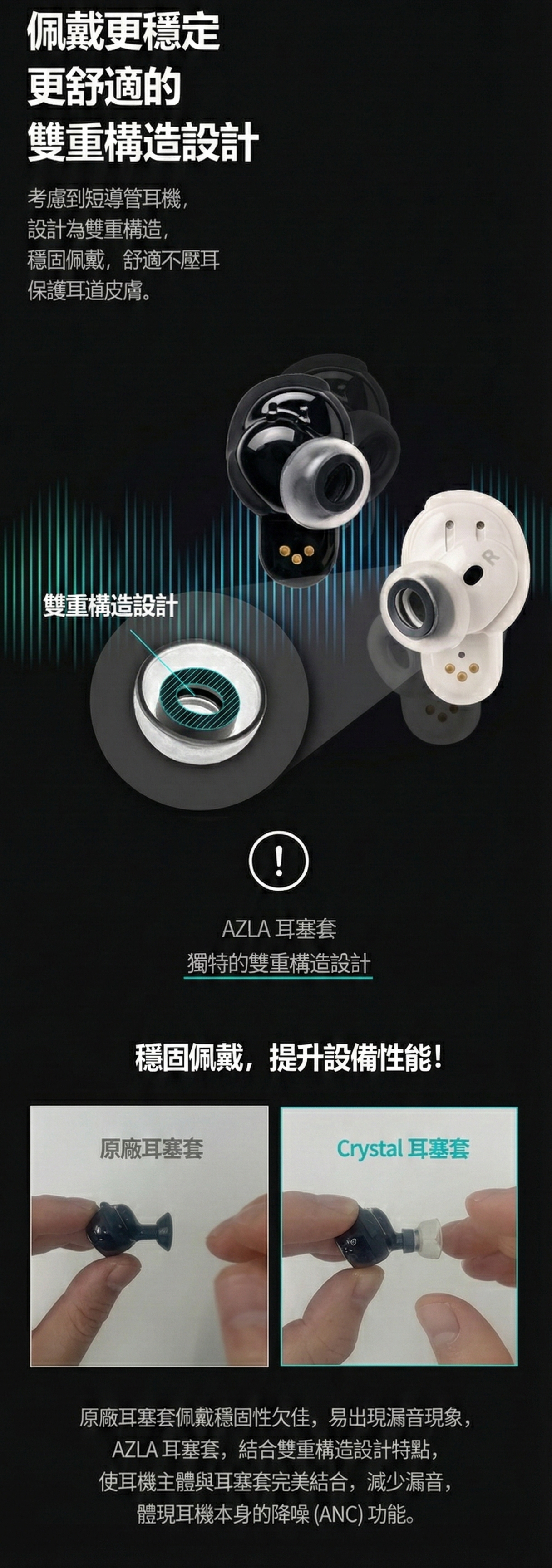 核心技術架構方面,SednaEarfit Crystal for BOSE Earbuds以材質、結構與適配三個方向構成主要優勢。材質部分使用德國優質LSR液態矽膠,具柔軟、彈性、耐用與低刺激特性,並通過RoHS與REACH認證,適合長時間接觸耳部肌膚。結構部分採用AZLA獨特雙重構造設計,外圈與內芯分工支撐,可在不過度壓迫耳道的前提下提升固定力與貼耳性。適配部分則是針對BOSE Earbuds產品外型與配戴特性開發,兼顧耳機本體貼合、裝入充電盒與日常取放操作,讓聲學密封與使用便利性能同時成立。