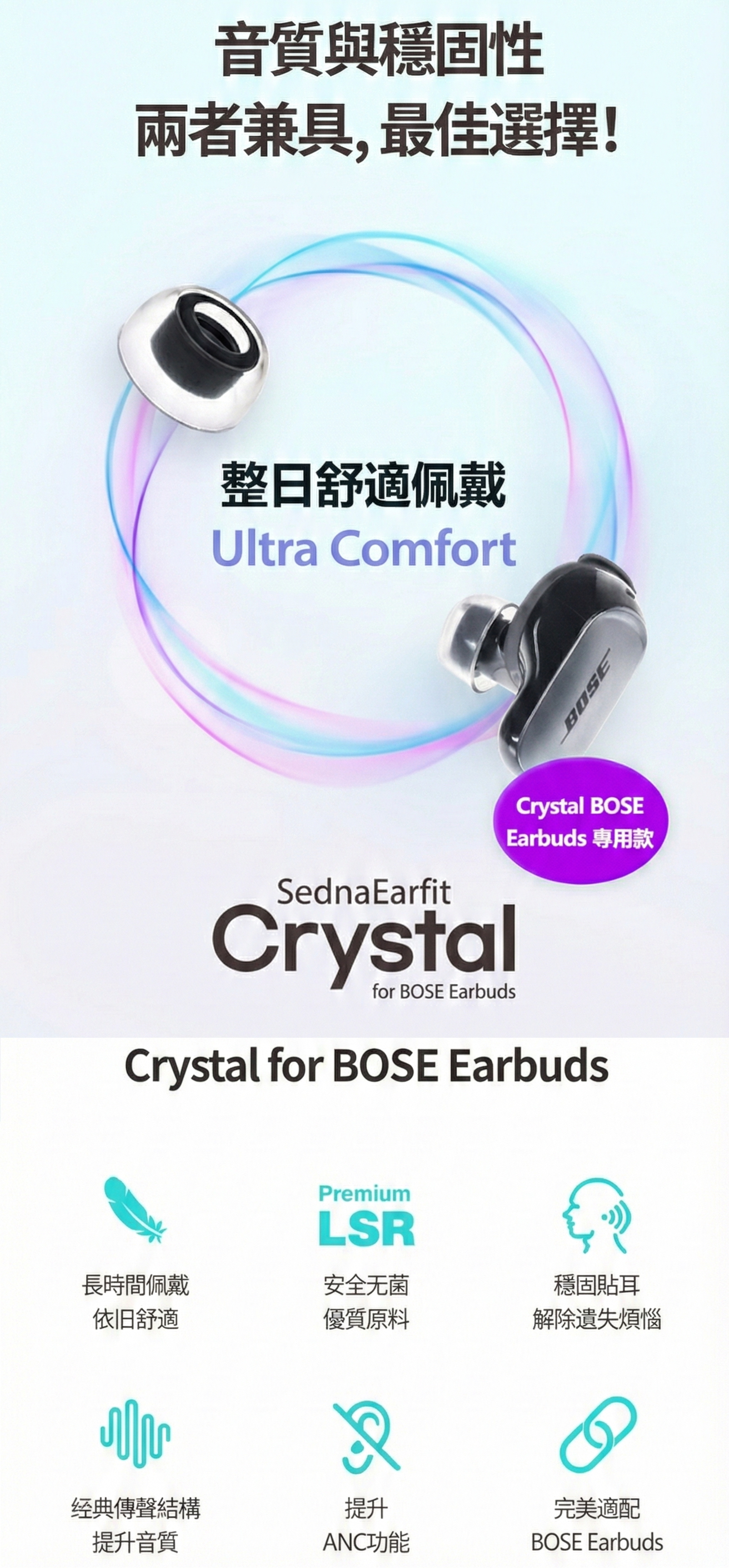 SednaEarfit Crystal for BOSE Earbuds是一款針對BOSE真無線耳機使用情境所開發的專用耳塞套,設計核心在於同時提升佩戴穩定性、舒適度與聲學密合表現。其採用透明外觀結合雙重結構配置,並以德國LSR液態矽膠作為主要材質基礎,讓耳塞套在長時間佩戴時維持柔軟服貼,同時兼顧支撐性與日常清潔便利性。整體定位並非單純替換耗材,而是以耳道貼合、穩固配戴與設備性能發揮為導向的專用升級配件。