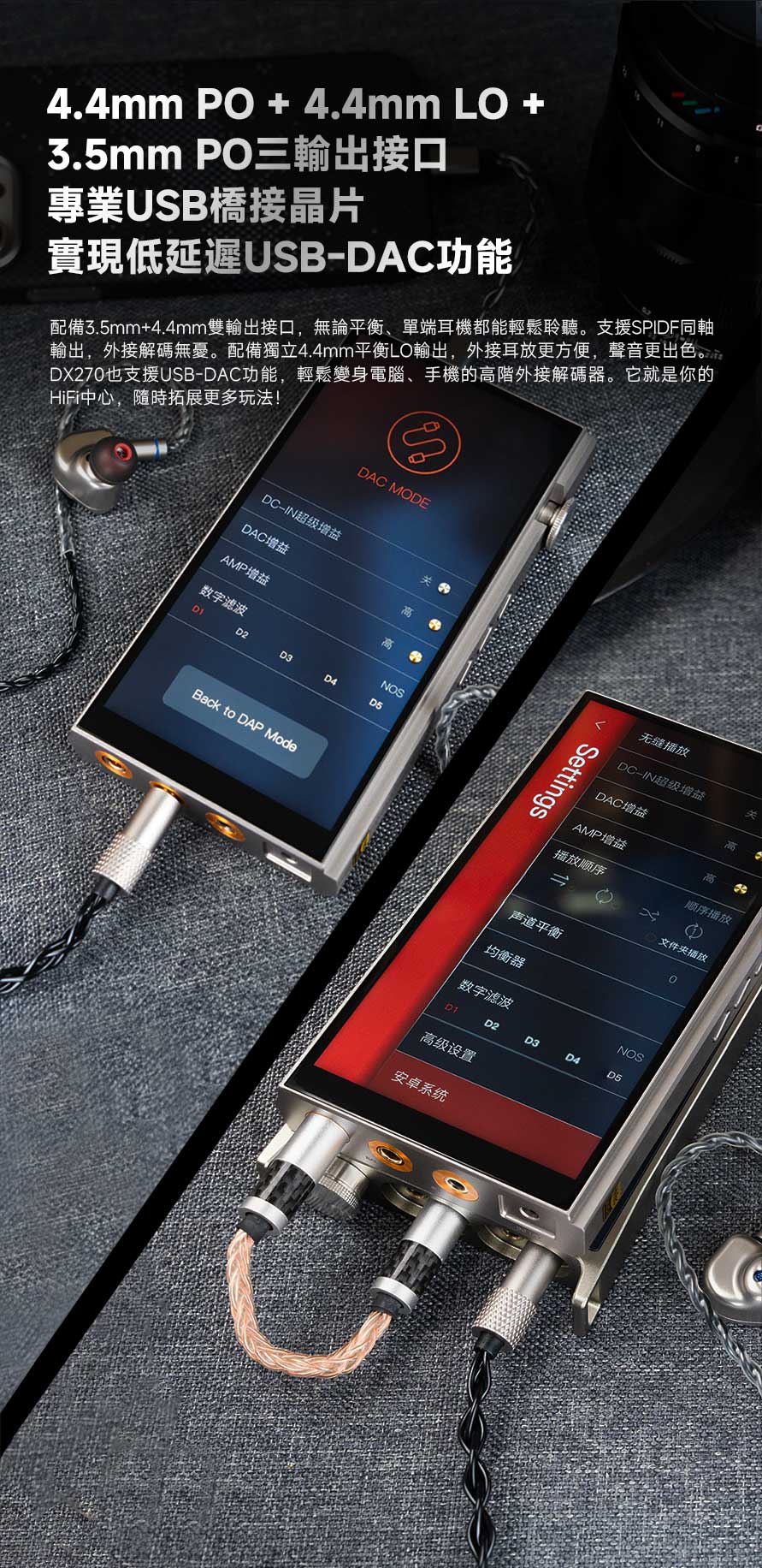 系統部分搭載高通驍龍 665 SoC,提供流暢操作體驗。除 Android 13 系統外,亦內建基於 Linux 的 Mango OS 純音系統,繞過系統 SRC,降低干擾與 EMI,讓聲音更純淨。搭配多組輸出介面與 USB-DAC 功能,DX270 可隨情境靈活切換,成為完整的高階 Hi-Fi 核心。