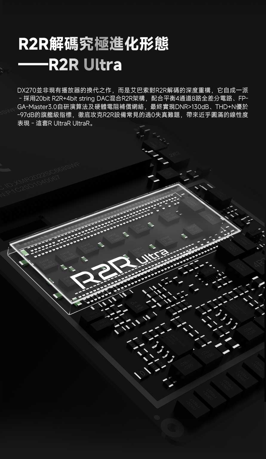 DX270 並非單純延續前代播放器設計,而是 iBasso 對 R2R 解碼架構進行深度重構的代表作。核心採用 R2R Ultra 解碼模組,結合 20bit R2R 與 4bit String DAC 的混合設計,在高位元段以 String DAC 處理,兼顧動態範圍與低失真,同時透過高精度電阻配置,實現更細膩且自然的聲音表現。
