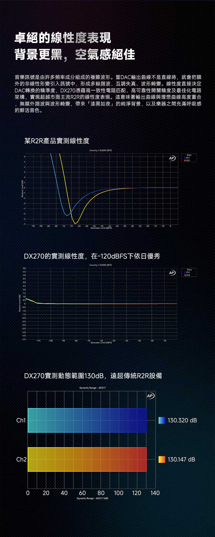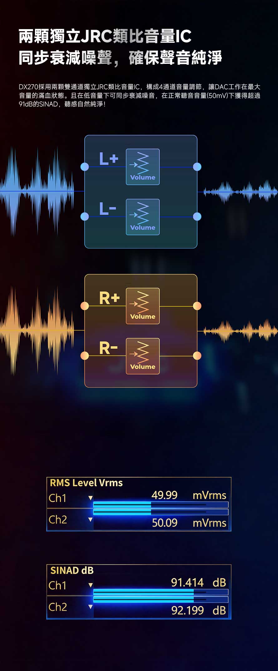 在電路架構上,DX270 採用 8 路 R2R 全差分設計,相較傳統單端 R2R 架構,在訊號同步、雜訊抑制與線性度上全面提升,有效解決 R2R 系統常見的過 0 失真問題,即使在極低音量下,也能保持聲音完整與穩定。