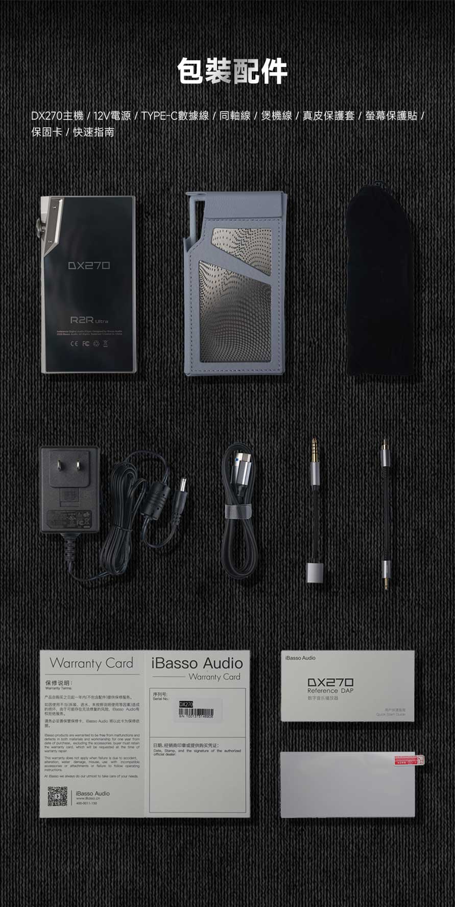 DX270 主機、12V 電源、Type-C 傳輸線、同軸線、煲機線、真皮保護套、螢幕保護貼、保固卡、快速指南