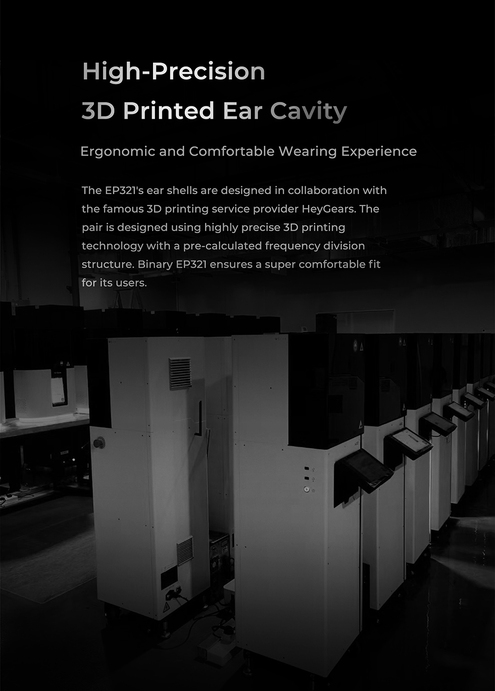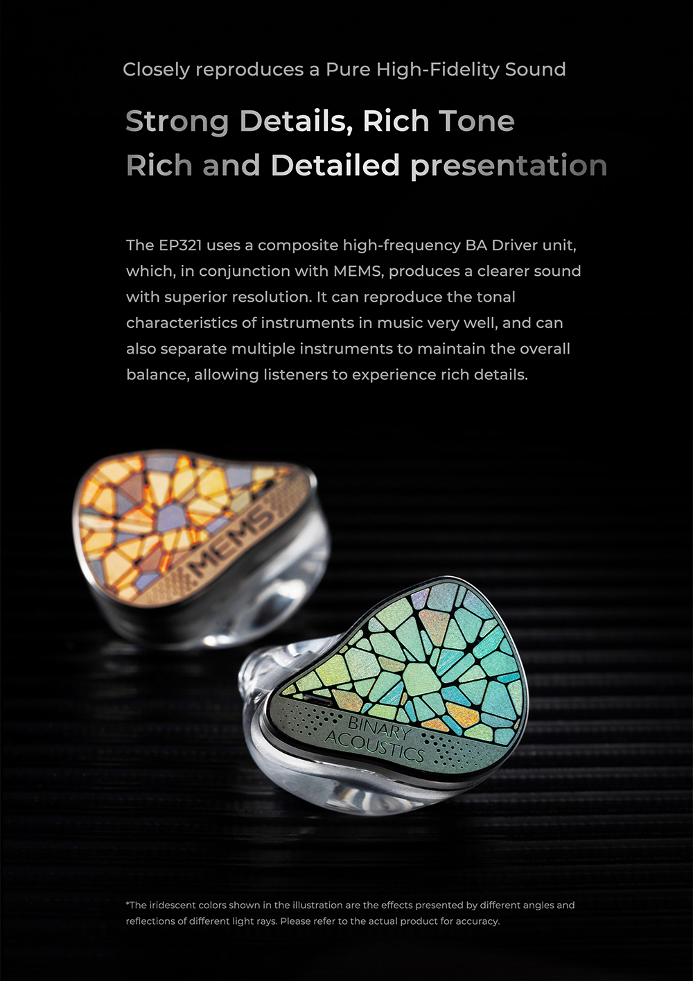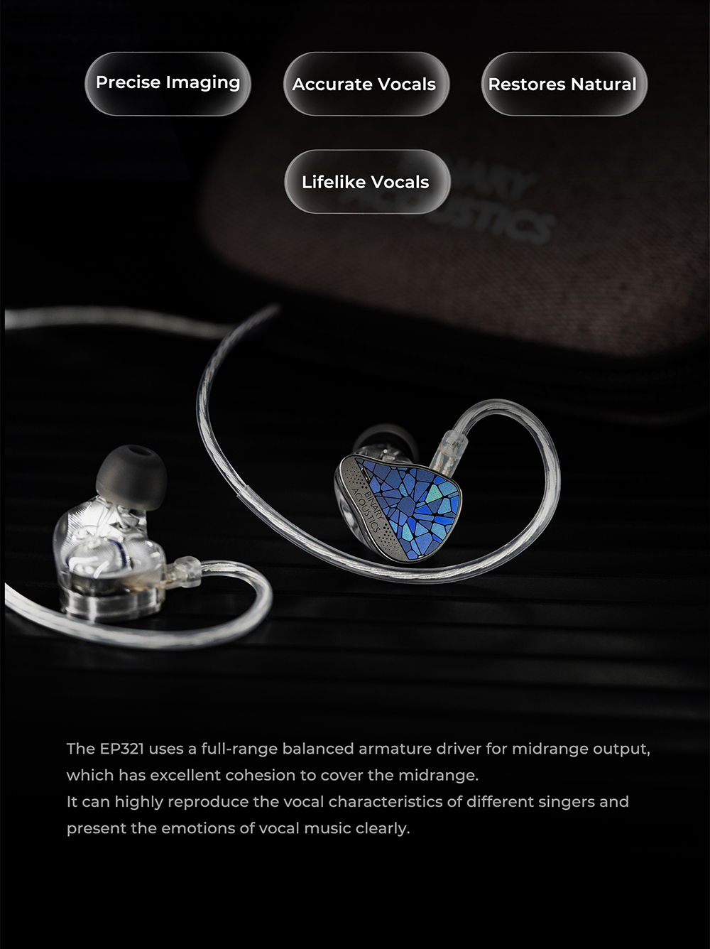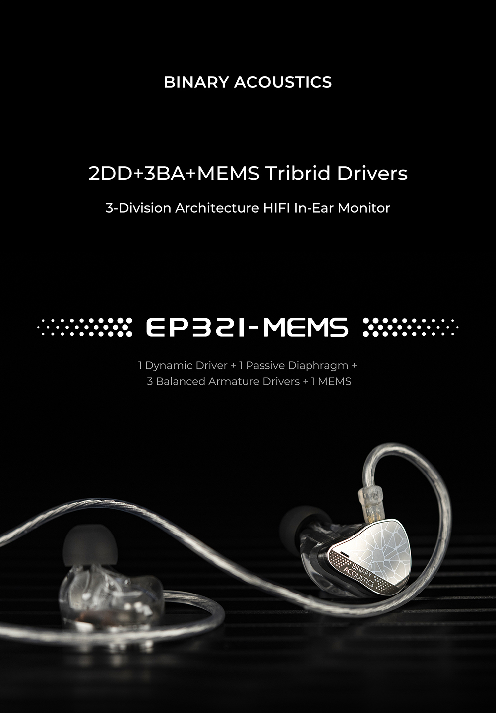 Binary EP321 為全球首款導入 Direct Drive MEMS 直驅技術的入耳式耳機,透過創新的聲學架構,將動圈、動鐵與 MEMS 單元整合於同一系統中,打造出前所未有的高解析聲音體驗。型號名稱「321」正代表其驅動配置:3 顆平衡電樞單元、2 顆動態單元與 1 顆 MEMS 單元,透過精密分頻與調校,達成高度一致且流暢的聲音銜接。