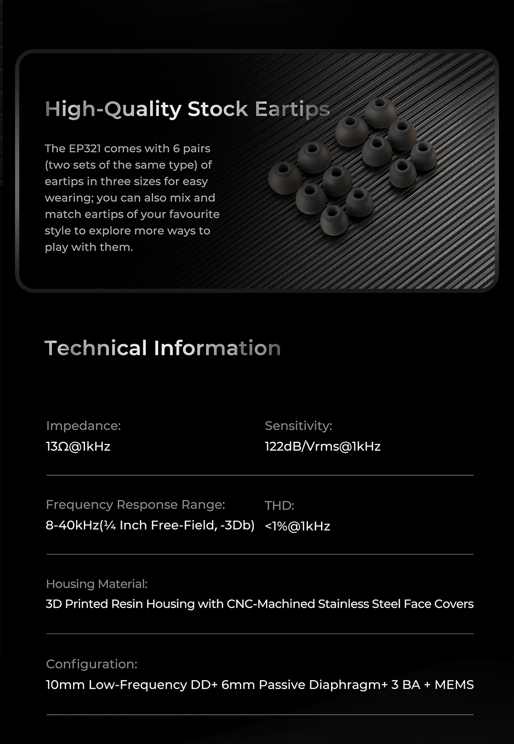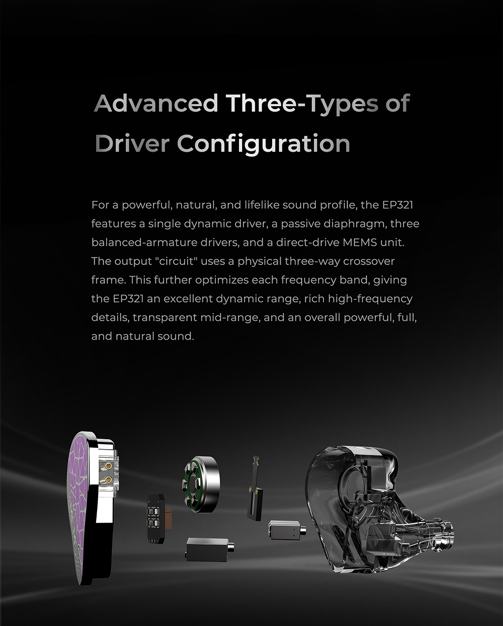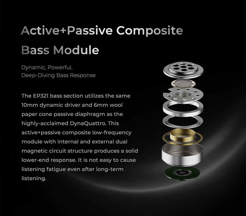 在高頻表現上,EP321 採用直驅 MEMS 單元技術,突破傳統 MEMS 需外接放大器的限制。內建激勵系統可直接驅動 MEMS 單元,專責超高頻段,帶來極快瞬態反應與極低失真的高頻延伸。細節呈現更加清晰透明,泛音豐富且不刺耳,讓整體聲音更具空氣感與層次。