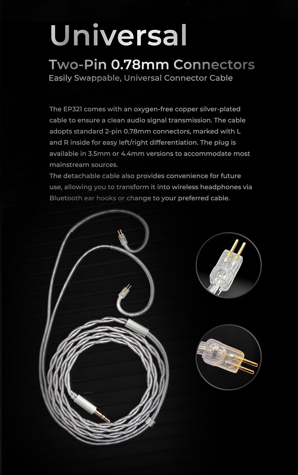● 標準 0.78mm 2Pin 可換線設計