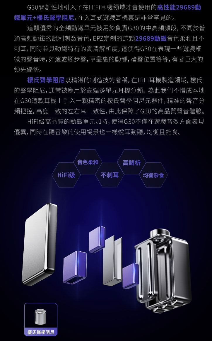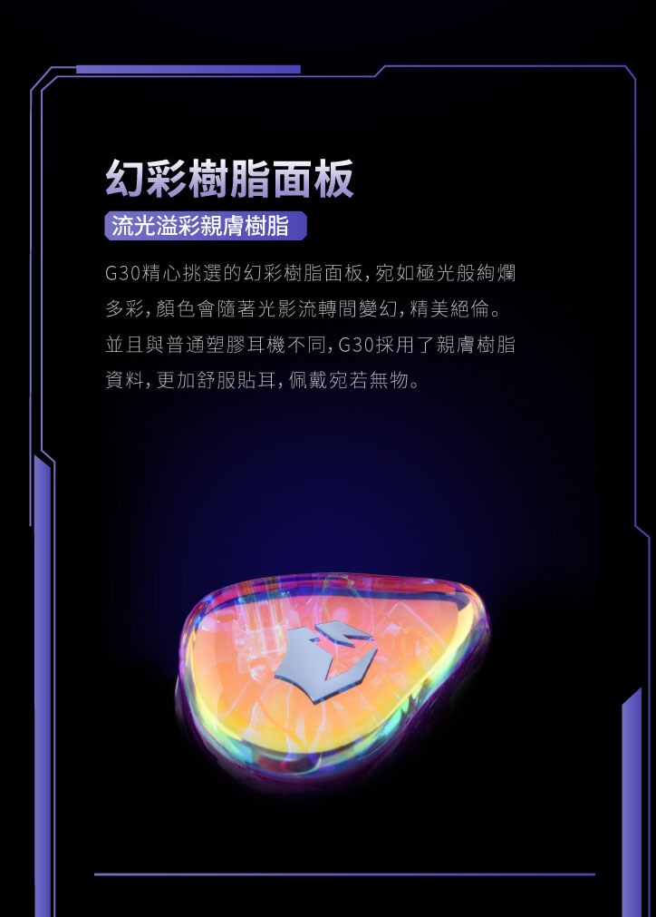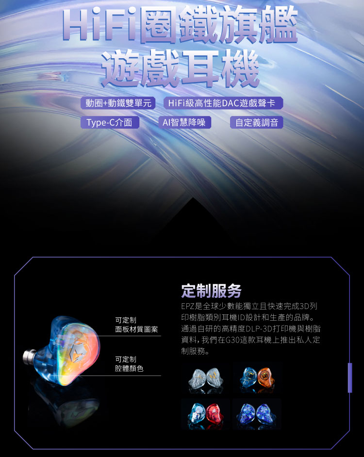 核心技術架構方面,G30 採用 EPZ 自研 9.2mm DLC+PU 複合膜片動圈單元,DLC 材料提供較高剛性與較低失真基礎,PU 則補足振膜運動時所需的柔韌性與低頻回彈,因此能兼顧解析、動態與低頻下潛。中高頻則交由 EPZ 定製 29689 動鐵單元負責,並搭配樓氏聲學阻尼進行聲音控制,使中高頻細節更清楚且不易過度刺激。腔體部分採高精度 DLP 3D 列印親膚樹脂結構,這屬於實際影響聲學穩定度、左右耳一致性與佩戴舒適度的結構材質;外觀上的幻彩樹脂面板則主要屬於視覺工藝與風格呈現,不應單獨視為聲音核心來源。