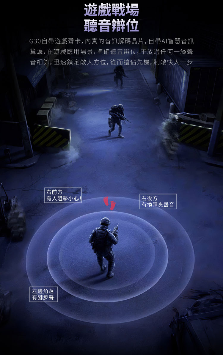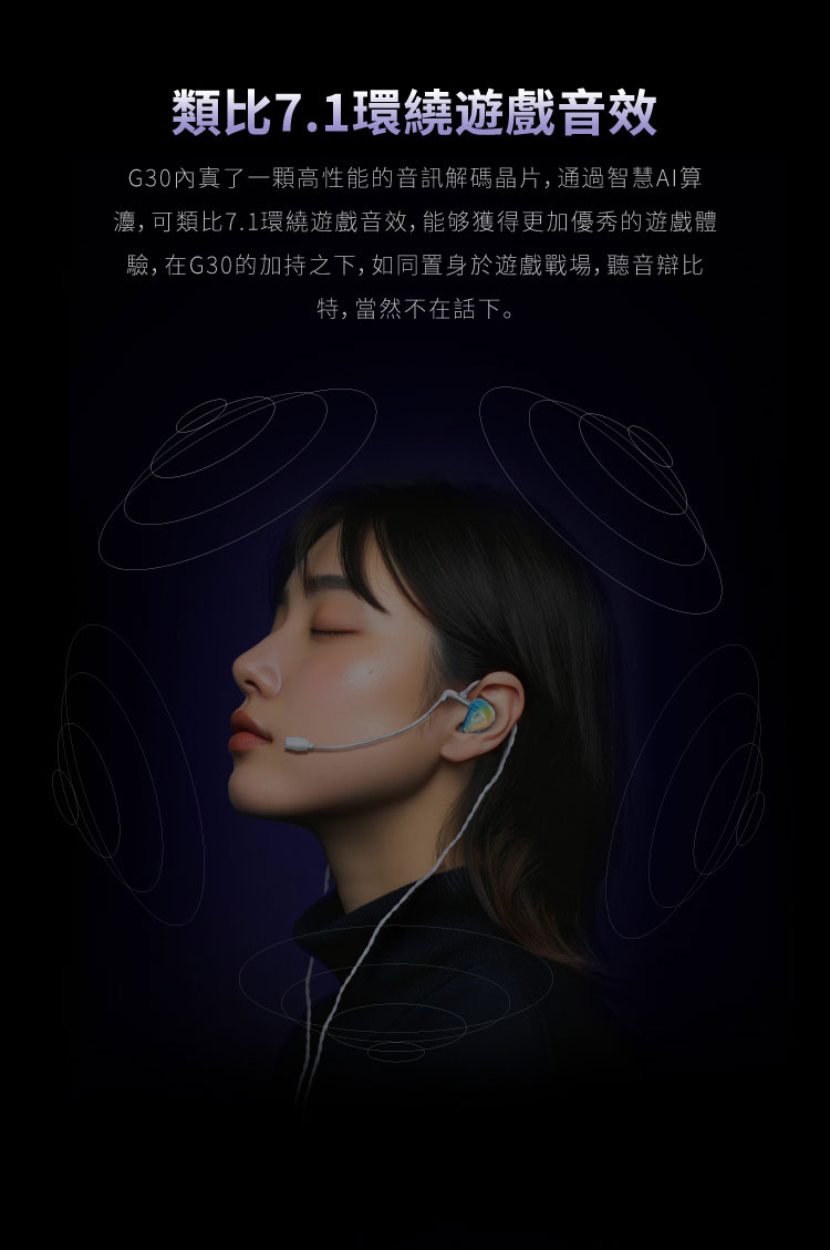 在整體使用取向上,G30 強調的是遊戲中常見聲音資訊的分離、定位與辨識能力。內建音訊解碼晶片與 AI 音訊運算設計,讓它在腳步聲、換彈聲、槍聲方向與環境細節呈現上更具條理,同時避免過度渲染造成聲音混濁。原廠亦強調其具備類比 7.1 環繞遊戲音效的應用訴求,但本質仍以精準辨位與監聽級輸出邏輯為核心,並非單純追求誇張包圍感。除了遊戲用途,G30 在音樂與日常影音場景下,也透過較均衡的能量分布保留不錯的泛用性。