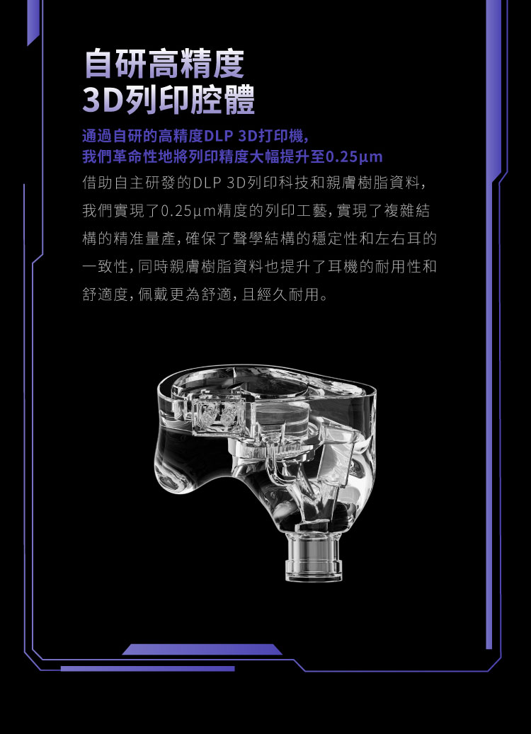 ● 高精度3D列印樹脂腔體,兼顧聲學一致性與佩戴貼耳舒適度