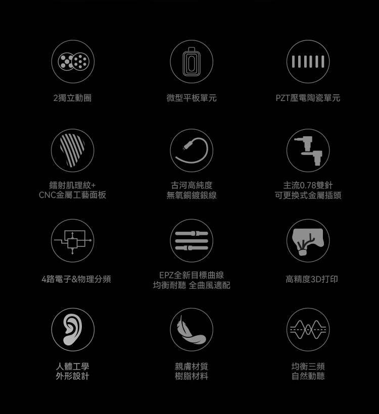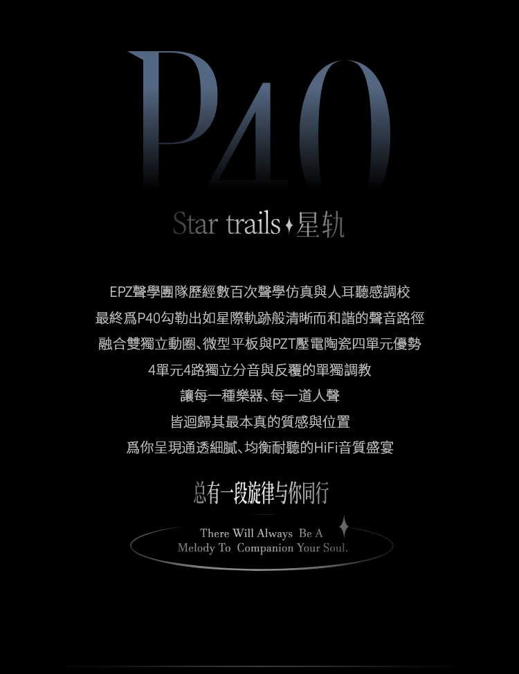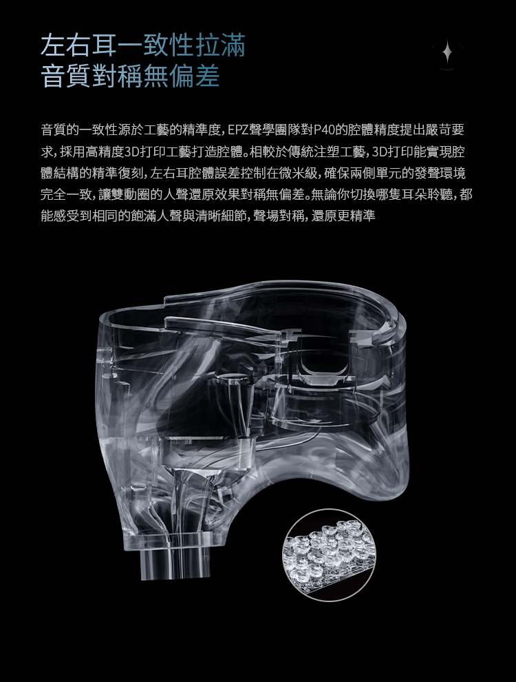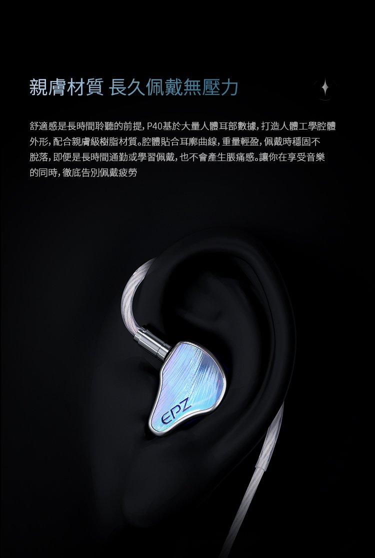 EPZ P40 以「多單元協同與聲學平衡」為核心設計方向,透過雙動圈作為聲音基礎,再加入微型平板與PZT壓電陶瓷單元,形成四單元混合架構。此設計的目的在於讓不同頻段由專屬單元負責,減少單一單元負擔過重所造成的失真與頻段互相干擾,並透過精準調校,使整體聲音呈現更自然且連貫的聆聽體驗,兼顧音樂還原與長時間聆聽的穩定性。