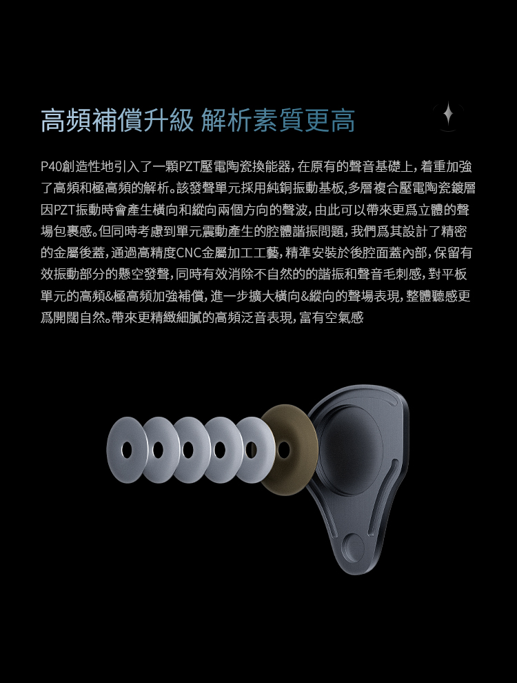 在核心技術架構上,P40 採用自研9mm DLC複合振膜動圈作為低頻單元,利用高剛性材料降低分割振動,使低頻下潛更穩定;7mm中頻動圈則透過雙磁路與腔體優化,專注於人聲與中頻細節呈現。高頻部分導入第二代微型平板單元,以平面驅動結構提升瞬態反應並降低失真,同時透過PZT壓電陶瓷單元補強泛音延伸。再搭配四路電子與物理分頻設計,使各單元之間的銜接更為順暢,達到相位一致與頻段分離的技術目的。