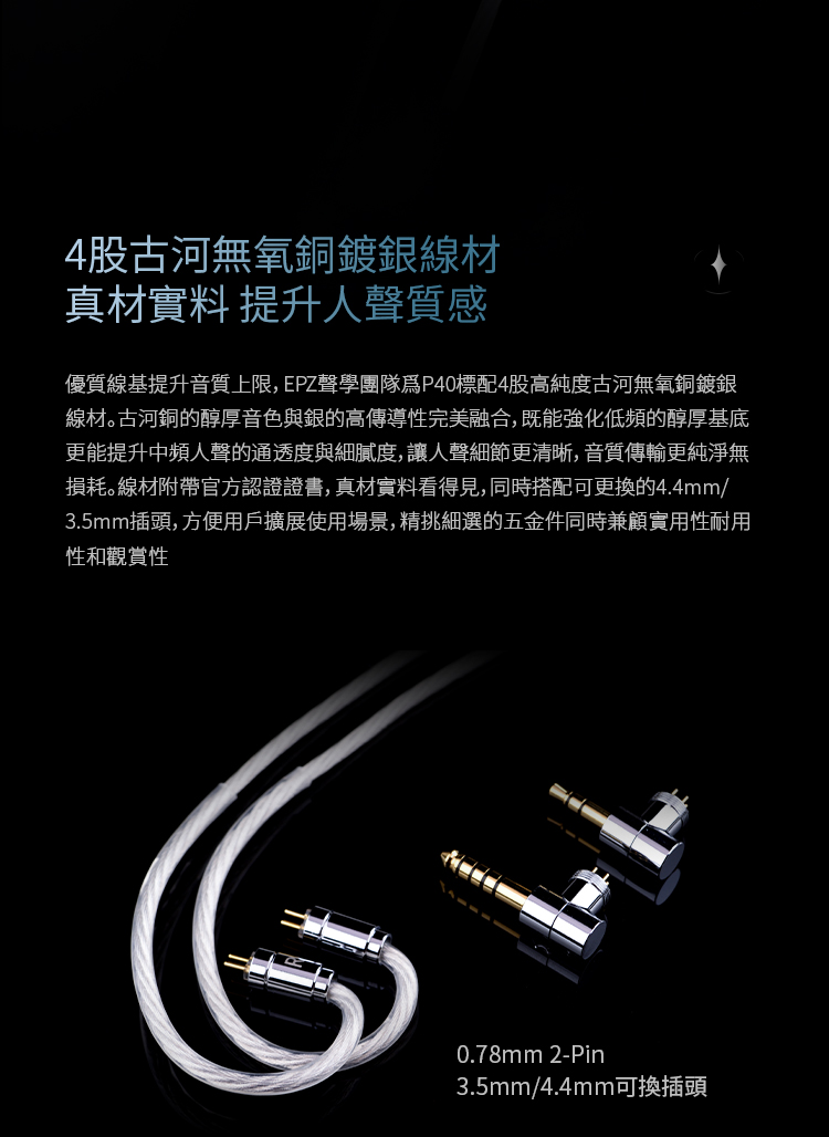 使用搭配上,P40 由於具備14Ω阻抗與100dB靈敏度,對前端設備的驅動需求相對友善,可搭配手機、隨身播放器或DAC/AMP使用。隨附模組化3.5mm與4.4mm插頭設計,能依不同設備快速切換,減少轉接損耗並提升使用便利性。線材採用古河無氧銅鍍銀結構,兼顧訊號傳輸穩定與耐用性,適合日常使用與進階音源系統搭配,能在不同使用情境下維持一致的聲音表現。