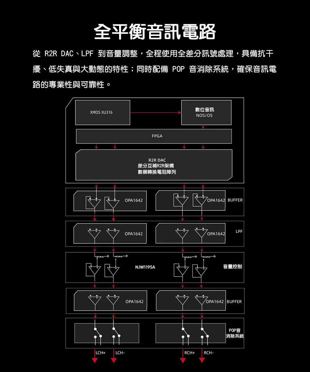● 從 R2R DAC、LPF 到音量控制皆採全差分音訊處理,兼顧抗干擾、低失真與大動態輸出特性
