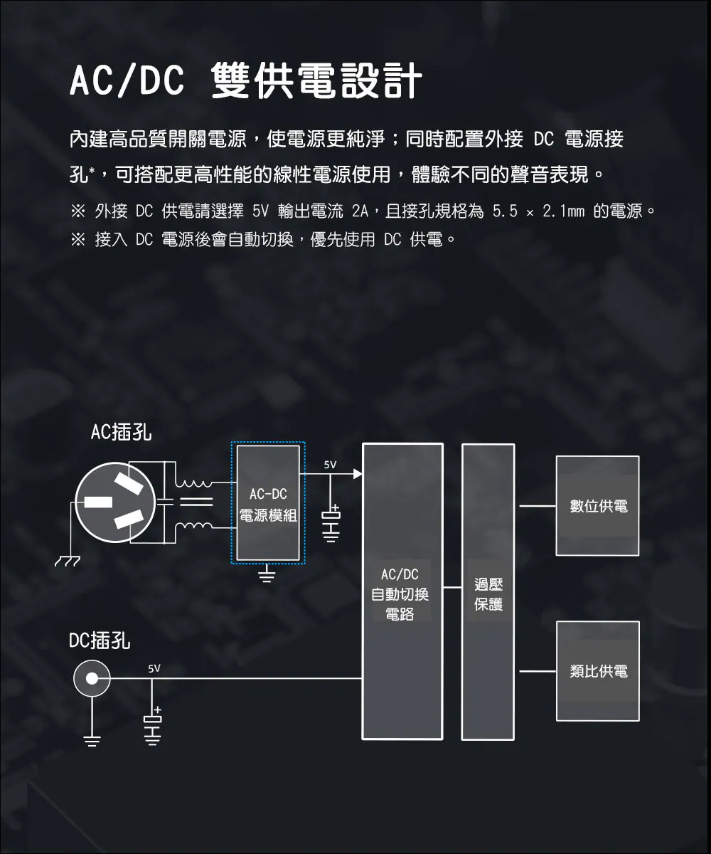 ● 採 AC/DC 雙供電設計,內建高品質開關電源,亦可外接 5V 線性電源進一步調整系統表現