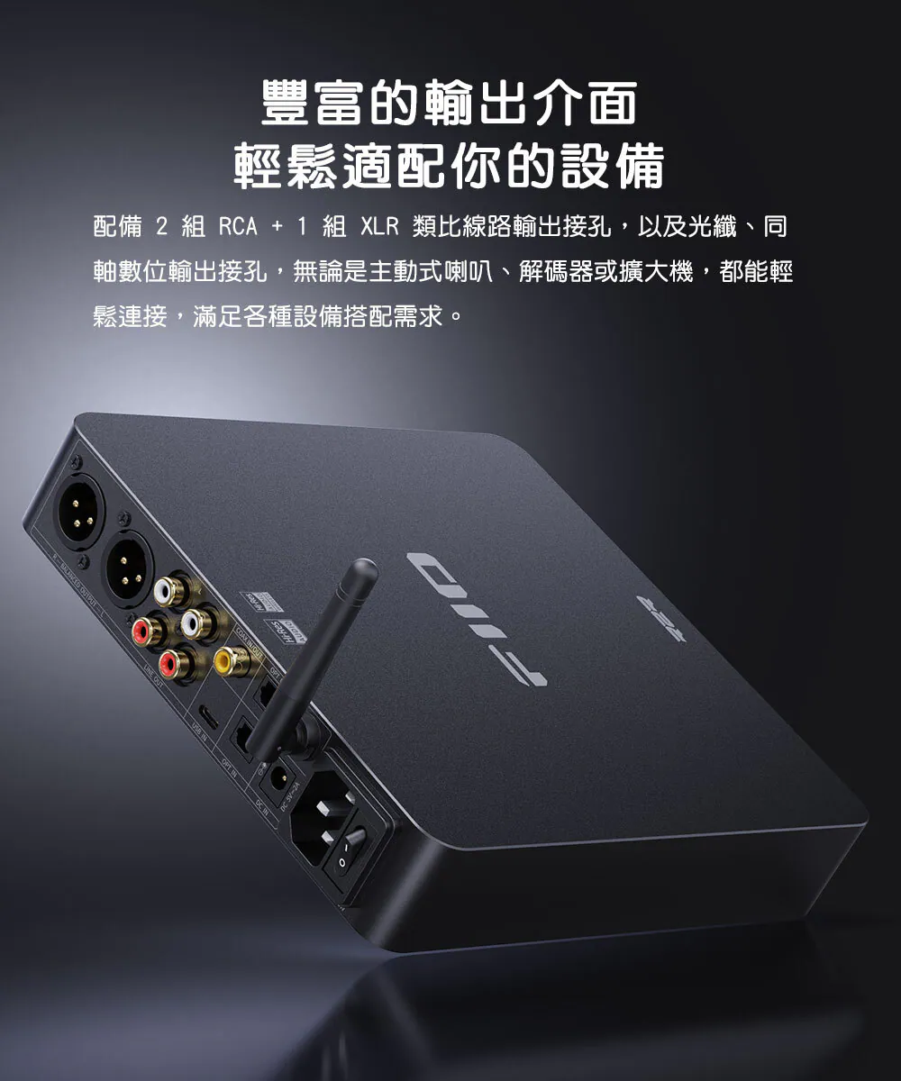 ● 配備 2 組 RCA 與 1 組 XLR 類比輸出,同時提供光纖與同軸數位輸出,系統搭配彈性高