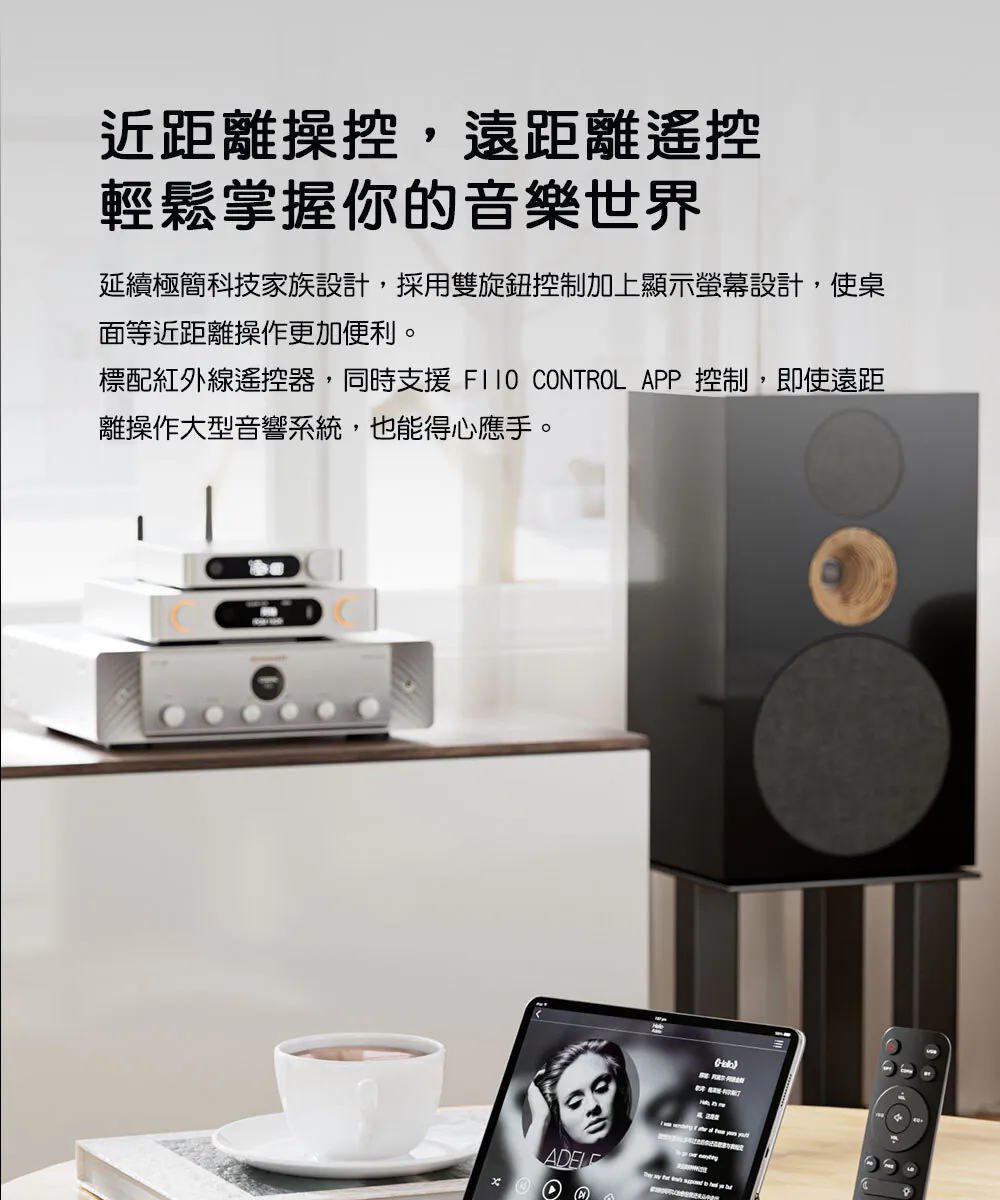 ● 1.47 吋彩色 LCD 顯示螢幕搭配雙旋鈕、紅外線遙控器與 FIIO CONTROL APP,近距與遠距操作都更便利