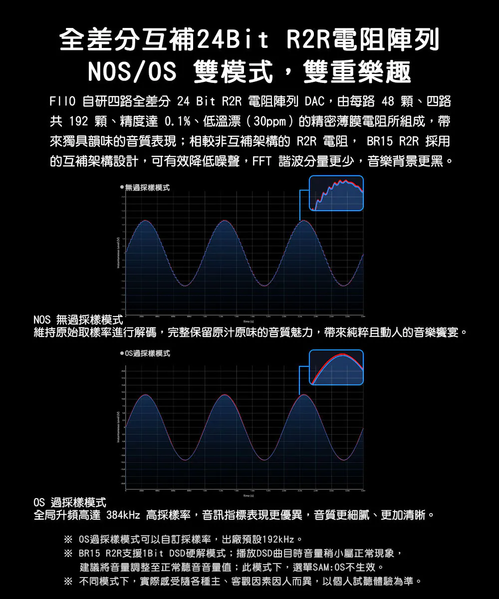 核心音訊架構方面,BR15 R2R 採用 FIIO 自研四路全差分互補 24Bit R2R 電阻陣列 DAC,每路 48 顆、四路共 192 顆精密薄膜電阻組成,並具備 0.1% 精度與低溫漂特性。相較一般非互補式 R2R 架構,這種全差分互補設計能有效降低噪聲,抑制諧波分量,使背景更黑、聲音層次更穩定,也更能保留 R2R 架構特有的自然韻味與密度感。NOS 模式保留原始取樣率解碼,呈現更直接、更具原味的音樂質感;OS 模式則進一步提升至 384kHz 過採樣,帶來更細膩、更清晰的音訊輪廓。這樣的雙模式設計,使 BR15 R2R 不只是一台功能型器材,也是一台能讓用家依系統與喜好調整聲音個性的音訊平台。