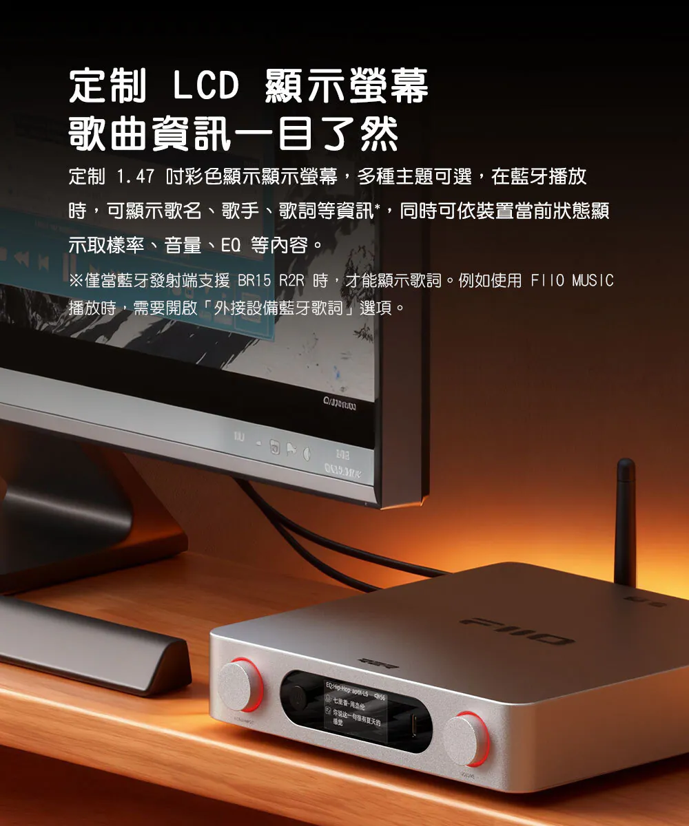 在系統整合與使用操作層面,BR15 R2R 提供藍牙、USB、同軸與光纖輸入,以及 RCA、XLR、同軸與光纖輸出,能夠對應主動式喇叭、擴大機、DAC、耳擴或其他數位音訊設備。全局 10 段 PEQ、AUTO EQ、內建預設音效與曲線管理功能,進一步讓它從訊源橋接器提升為可調聲、可校正的核心器材。雙旋鈕搭配 1.47 吋彩色 LCD 顯示螢幕,可清楚顯示取樣率、音量、EQ 與播放資訊;紅外線遙控器與 FIIO CONTROL APP 則讓遠距操作更符合家用音響使用習慣。若系統還有進一步升級需求,BR15 R2R 也支援 AC/DC 雙供電,可透過外接 5V 線性電源取得不同聲音取向與更進階的搭配空間,完整展現其作為桌面與家用音訊中樞的價值。