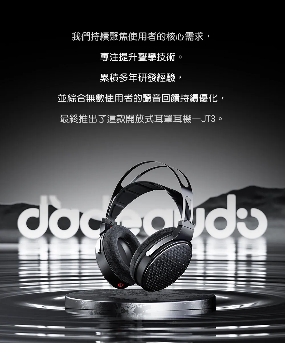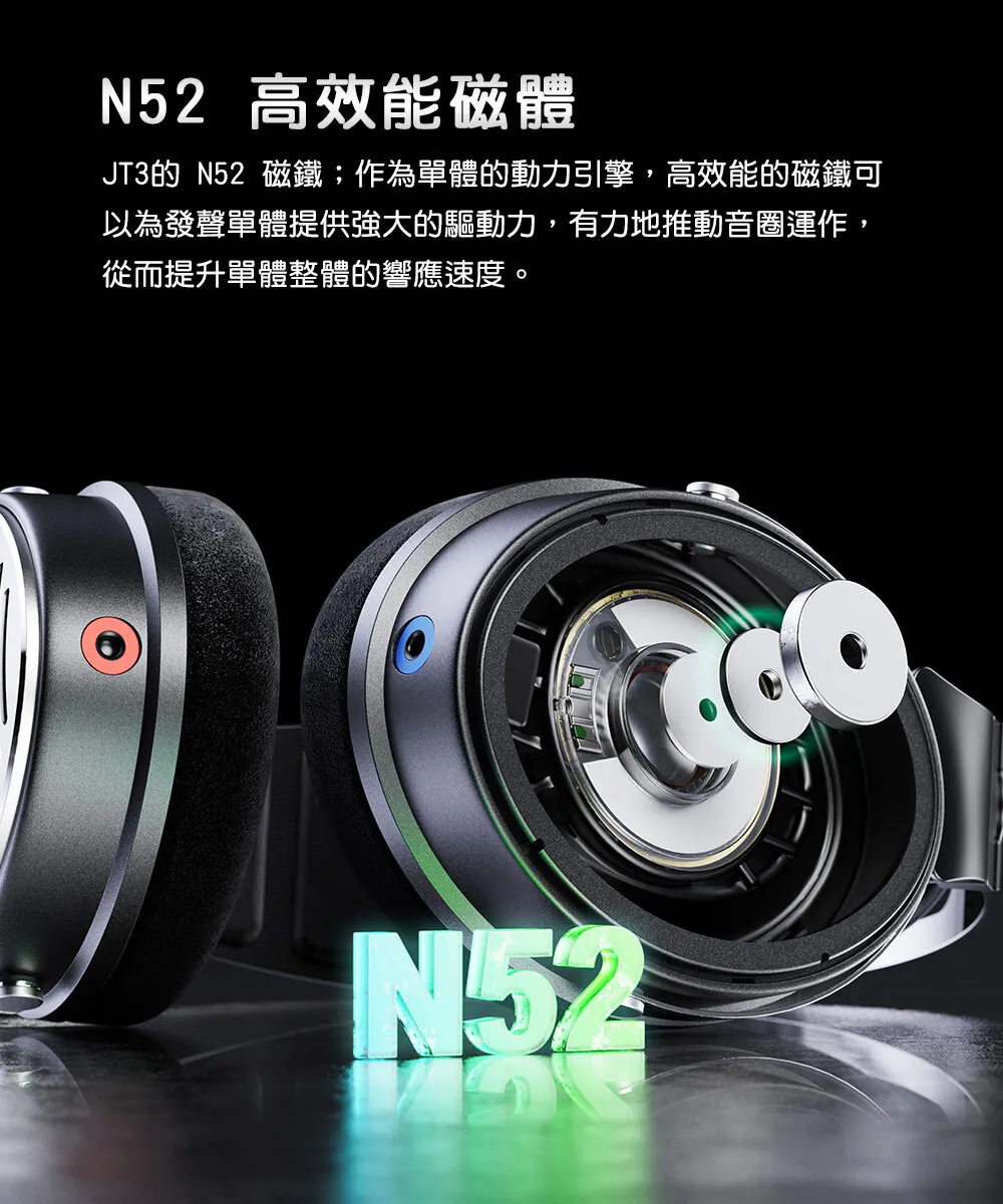 JT3 採用 50mm 大直徑動圈單體,更大的振膜面積能推動更多空氣流動,使低頻下潛更有力,同時營造出寬廣、開闊的音場表現。搭配開放式聲學架構,有效減少封閉式耳機常見的氣壓與駐波影響,讓聲音更貼近自然聆聽環境,呈現清楚的空間層次與定位感。