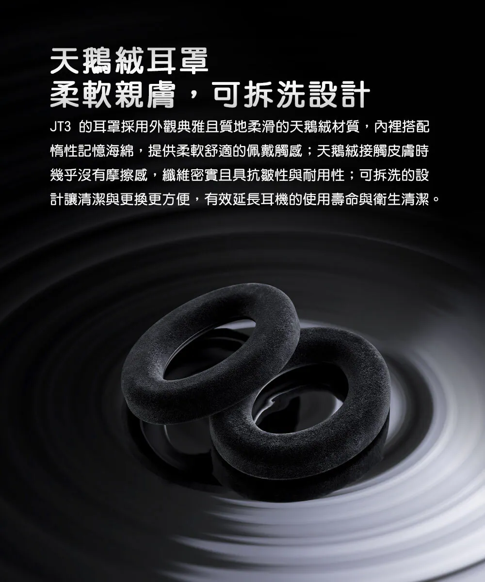 外觀與配戴方面,JT3 採用鋁鎂合金格柵式外殼,不僅提升整體質感,也讓聲音能更均勻地逸出。側置式單體設計使發聲角度更符合耳廓結構,聲音傳遞更直接。搭配天鵝絨可拆洗耳罩與穩定的頭戴結構,長時間配戴依然保持舒適與耐用。