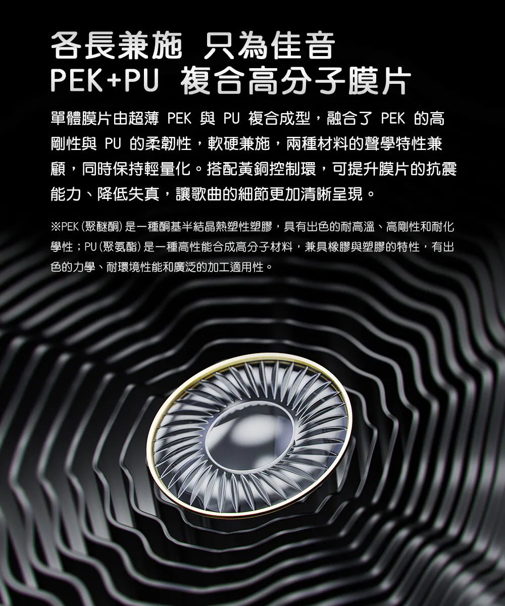 ● PEK+PU 複合高分子膜片,兼顧剛性與柔韌度,細節更清晰