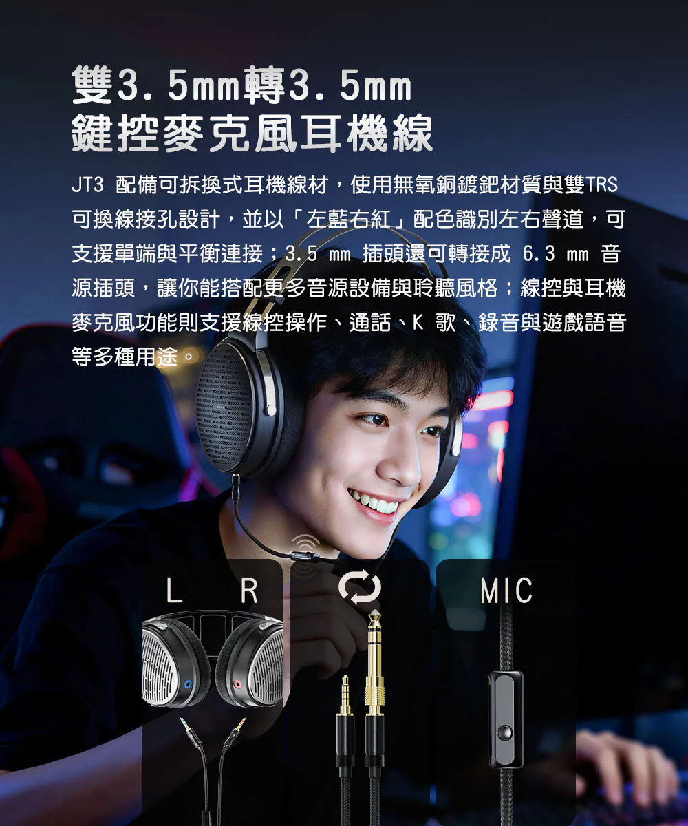 ● 可拆換雙 3.5mm 線控麥克風耳機線,支援通話與多元用途