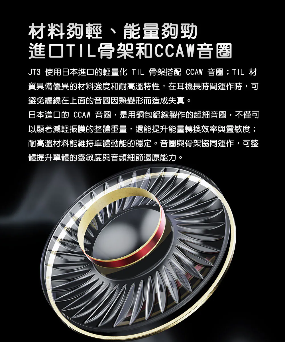 在單體結構上,JT3 使用 PEK 與 PU 複合高分子膜片,結合高剛性與柔韌特性,在控制失真的同時保有豐富細節。日本進口 TIL 音圈骨架與 CCAW 音圈的搭配,兼顧輕量化與耐高溫特性,使單體在長時間運作下依然維持穩定表現;再加上 N52 高效能磁鐵,提供充足驅動力,讓聲音反應更迅速。