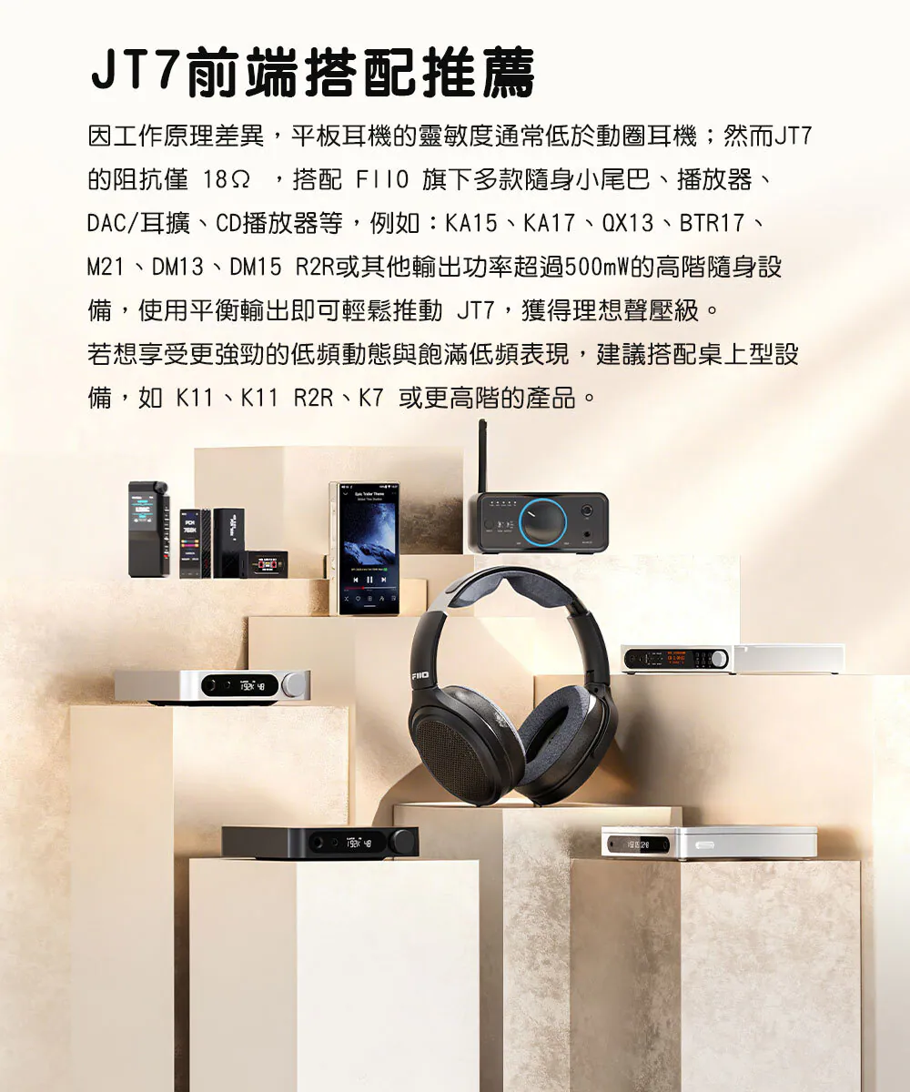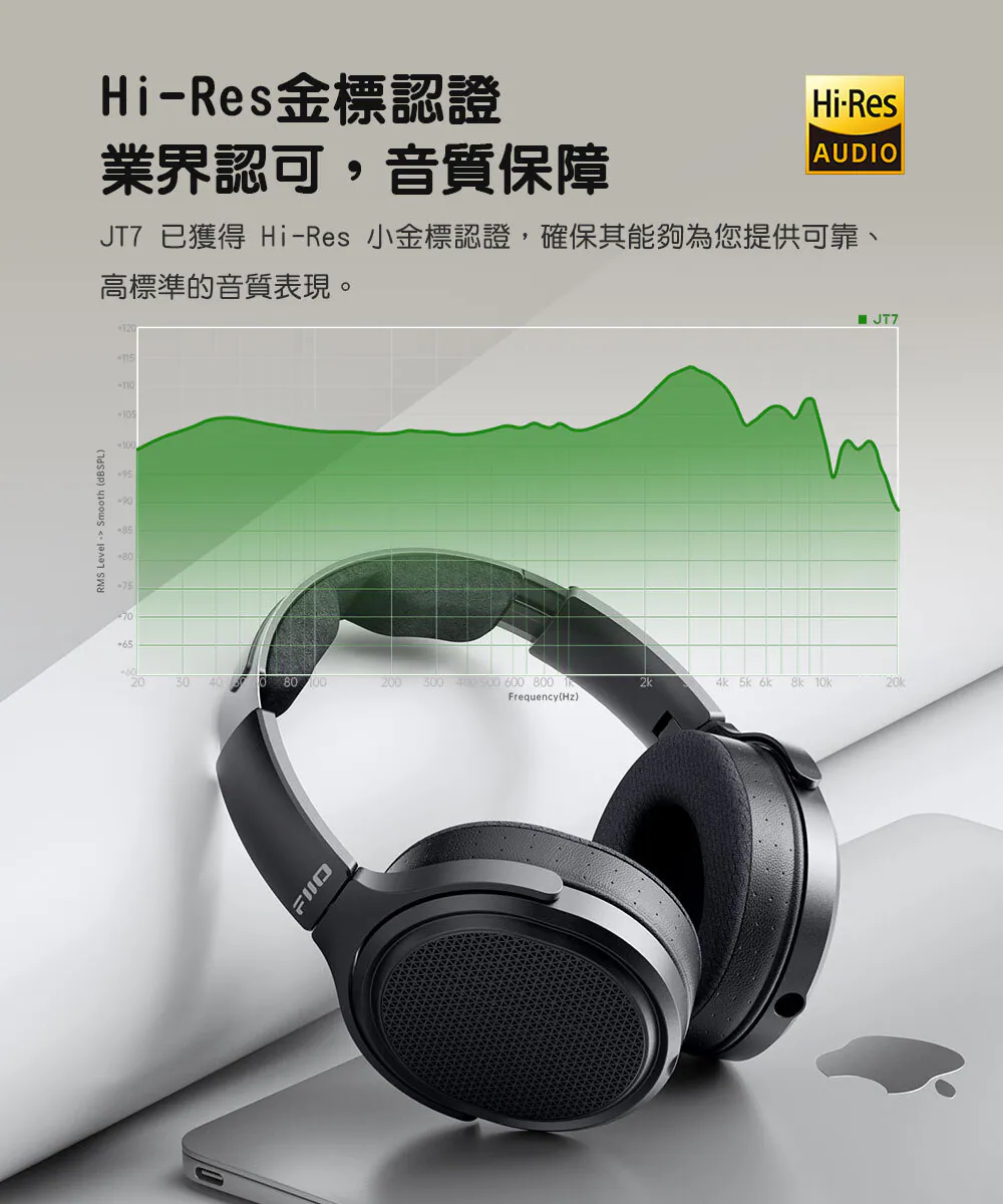 JT7 已通過 Hi-Res Audio 金標認證,確保其具備高標準音質表現。無論搭配隨身播放器、DAC/耳擴或桌上型系統,都能展現平板振膜耳機特有的通透音場與細膩解析。