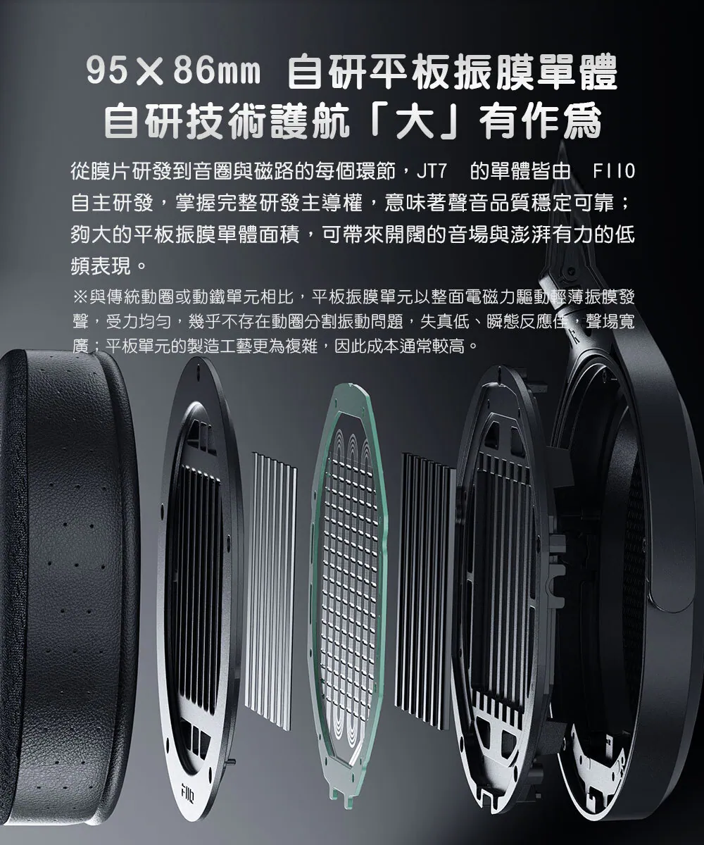 JT7 採用 95 × 86 mm 自主研發的平板振膜單體,從膜片、音圈到磁路皆由 FIIO 完整掌控研發流程,使聲音品質穩定可靠。大面積平板振膜能帶來寬廣的音場表現,同時兼顧充沛且有力的低頻量感,呈現開闊自然的聲音走向。