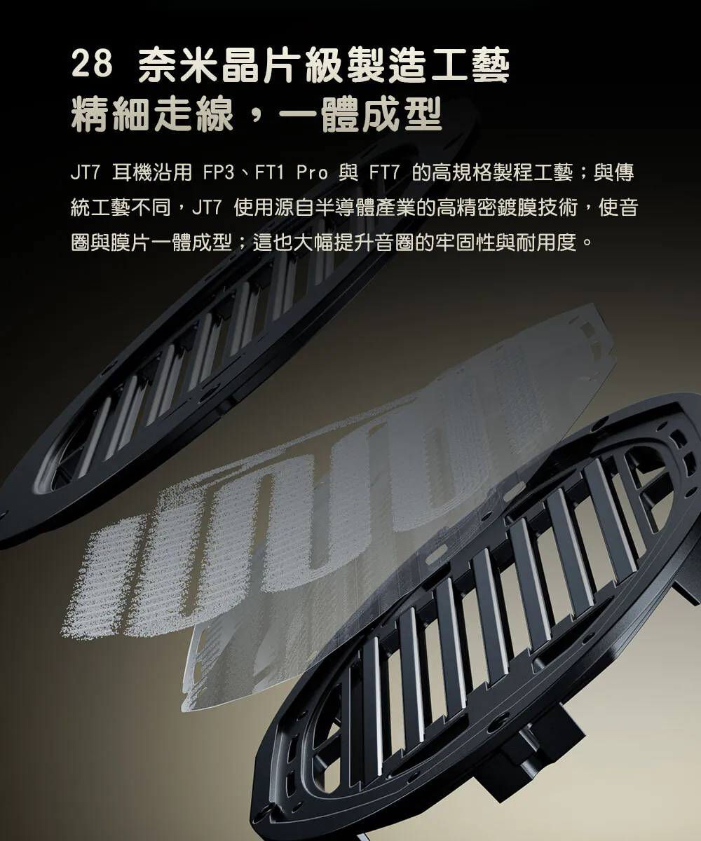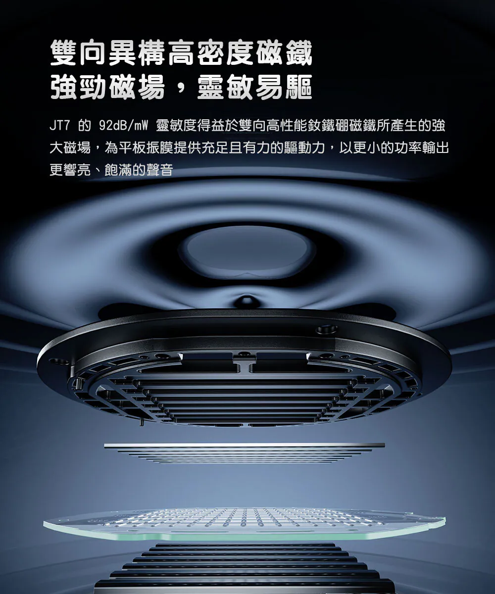 JT7 採用雙向異構高密度釹鐵硼磁鐵配置,提供強勁且穩定的磁場,讓平板振膜在較低功率下即可獲得充足驅動力,實現更高靈敏度與更響亮、紮實的聲音表現。