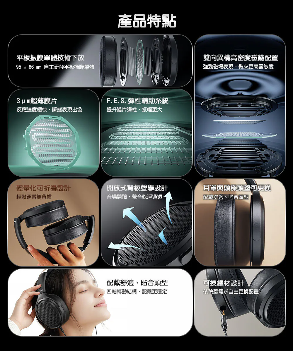 振膜部分採用僅 3 μm 的超薄平面膜片,能精準捕捉電訊號的細微變化,帶來快速的瞬態反應與明亮清晰的高頻延伸,讓音樂中的細節層次更加鮮明。搭配專利 F.E.S(FIIO Elastic System)彈性輔助系統,在膜片表面加入多維紋理設計,提升振膜彈性與振幅,使低頻表現更加飽滿且自然,同時有效控制失真。