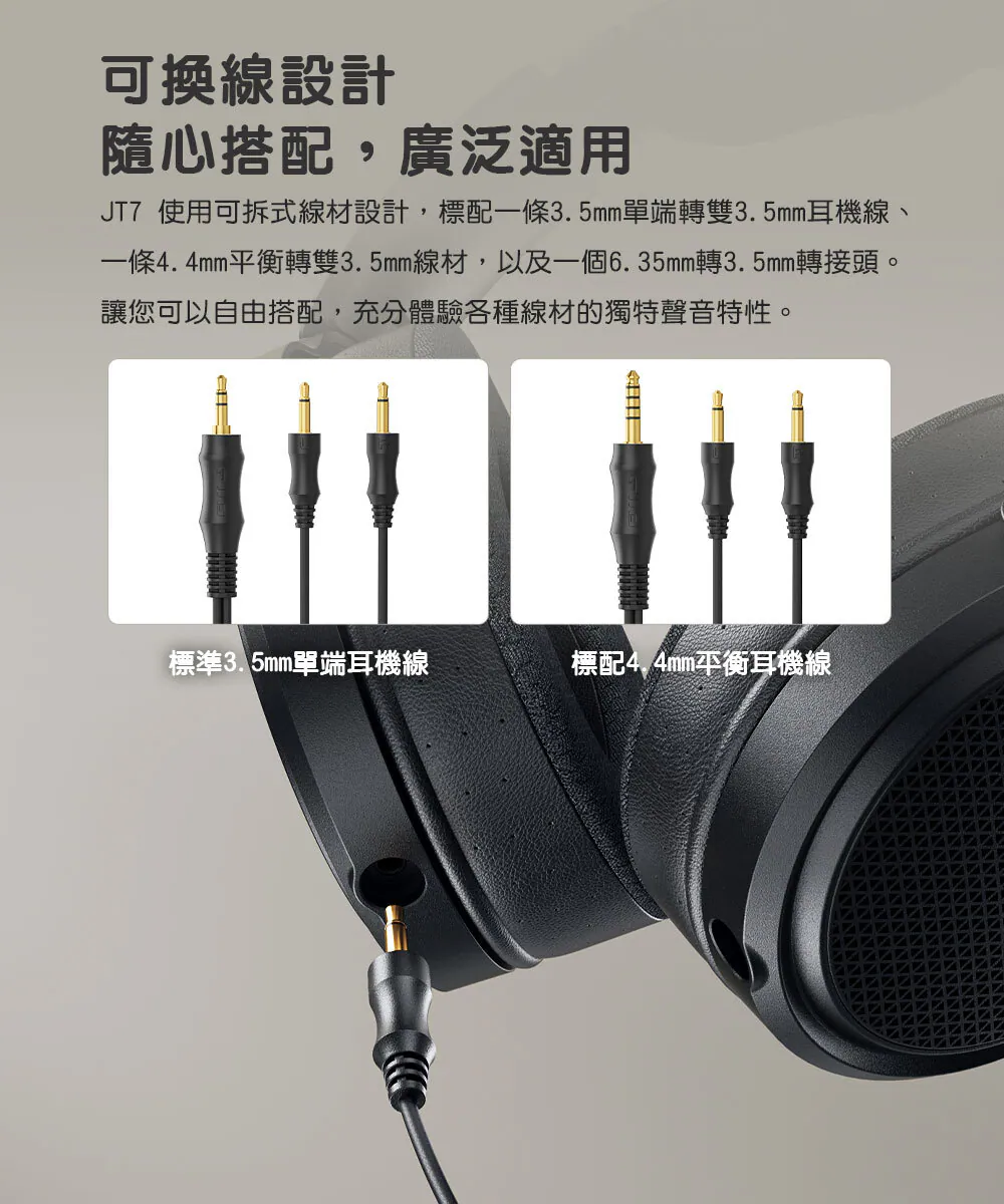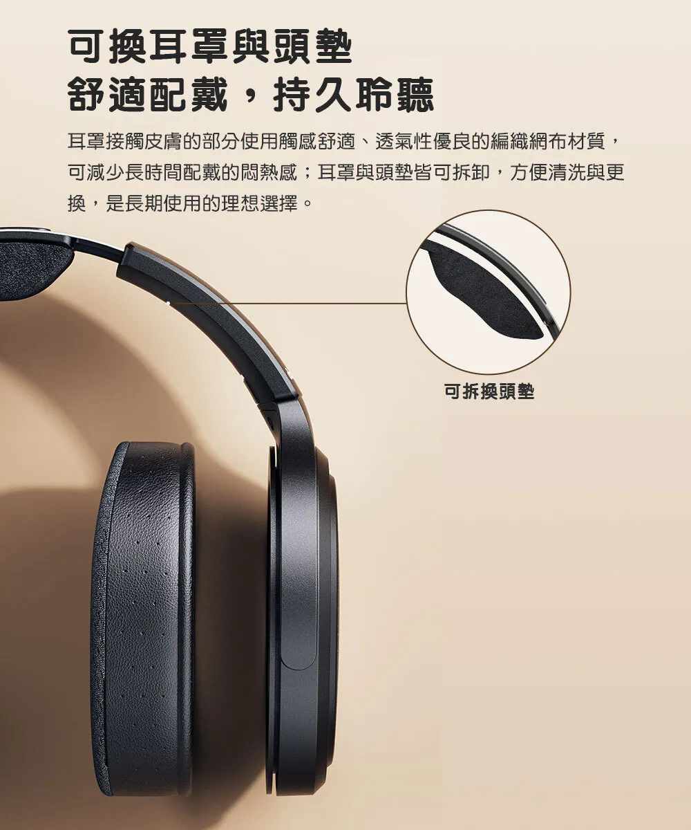 耳罩與頭墊採用觸感柔軟、透氣性佳的編織網布材質,可有效降低悶熱感,且皆可拆卸清洗與更換,適合長期使用。可換線設計則提供更高搭配彈性,隨附 3.5mm 單端與 4.4mm 平衡耳機線,並附 6.35mm 轉接頭,能對應各式隨身與桌上音響設備。