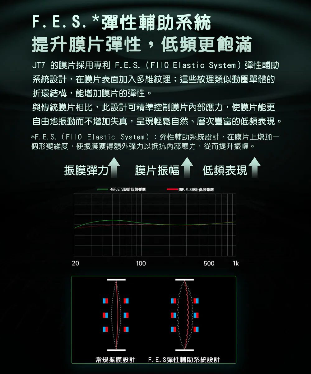 ● F.E.S 彈性輔助系統,提升振膜彈性與低頻飽滿度