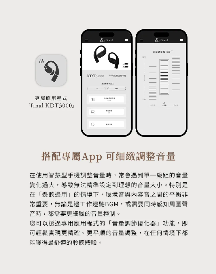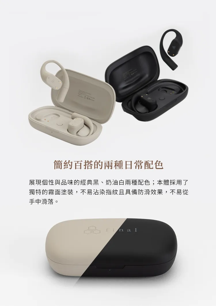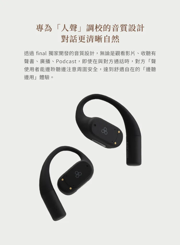 Final KDT3000 是 Final 打造的全新開放式耳掛藍牙耳機,主打「邊聽邊用」的日常聆聽體驗。無論在通勤、工作或休閒時,皆能同時享受音樂並注意環境音,提升使用安全性與便利性。
