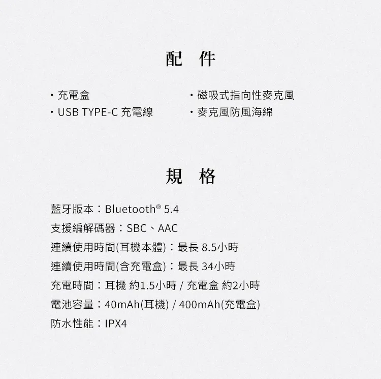 電池容量:40mAh(耳機) / 400mAh(充電盒)