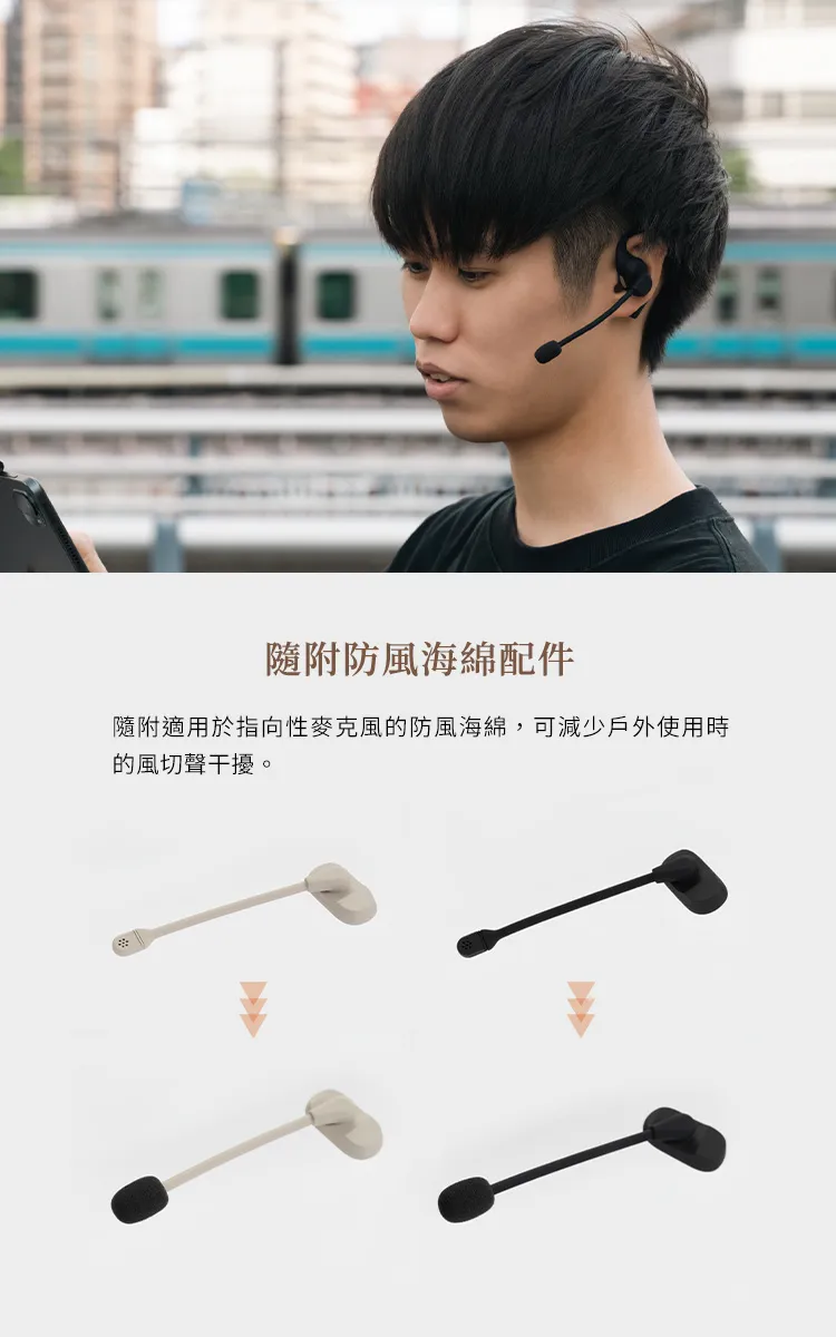 IPX4 等級防水讓你在雨天或運動時依然安心使用,兩種霧面配色(黑、奶油白)兼具質感與防滑效果。內附防風海綿配件,有效降低戶外風切聲干擾。