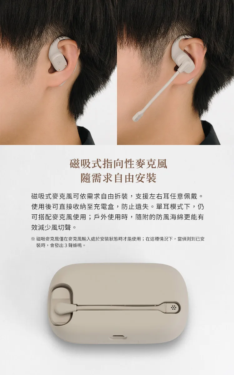 搭載高性能 AI 降噪麥克風,並隨附磁吸式指向性長桿麥克風,在嘈雜環境中依然能準確收音,讓對方聽到的是清晰人聲而非背景雜音。麥克風可自由拆裝並支援左右耳任意佩戴,使用後可收納至充電盒,便攜又不易遺失。