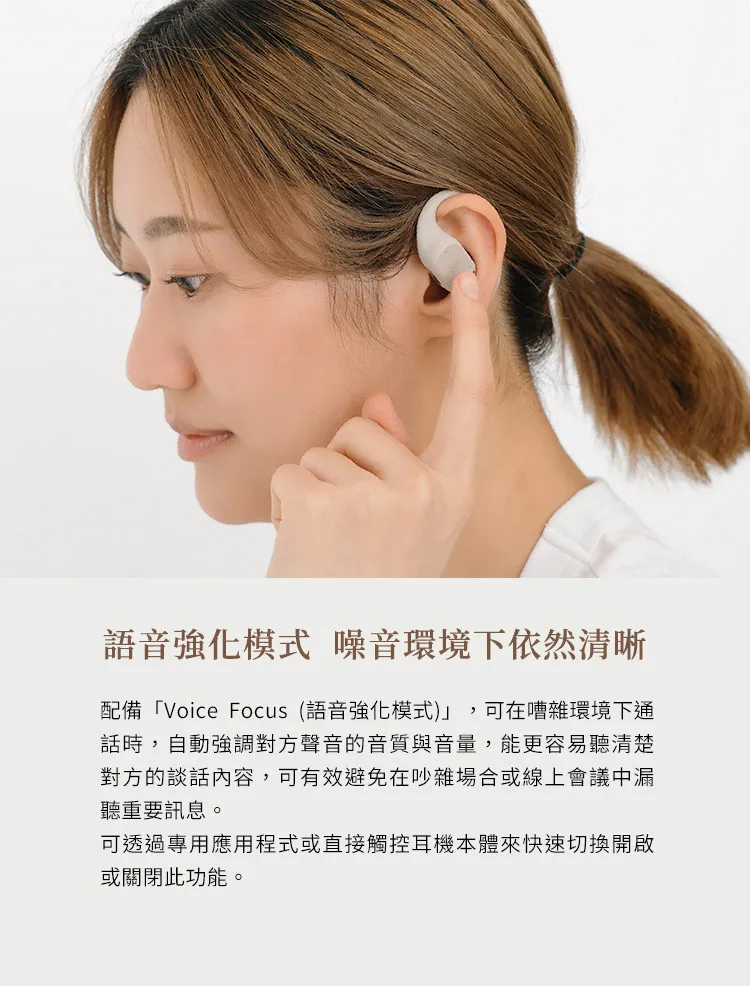 耳機採用專為人聲調校的音質設計,即使提高音量也不會蓋過外部聲音,讓 Podcast、廣播、語音會議或影片內容都能清晰聽取,同時掌握周遭動態。